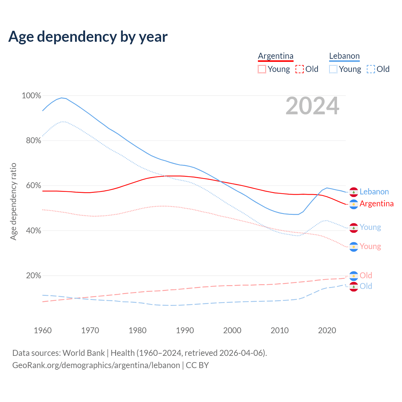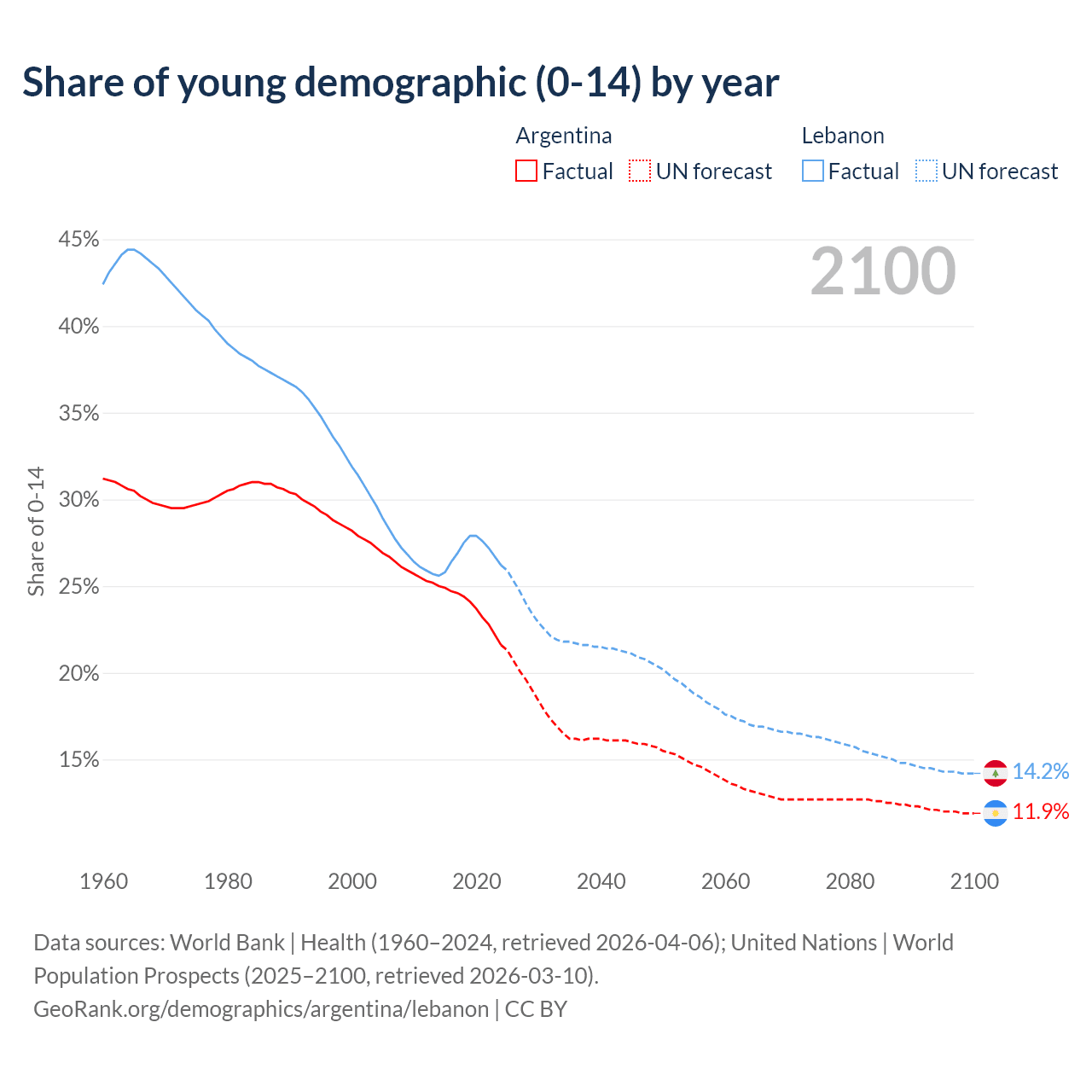 Median age Argentina vs Lebanon, 1960-2100