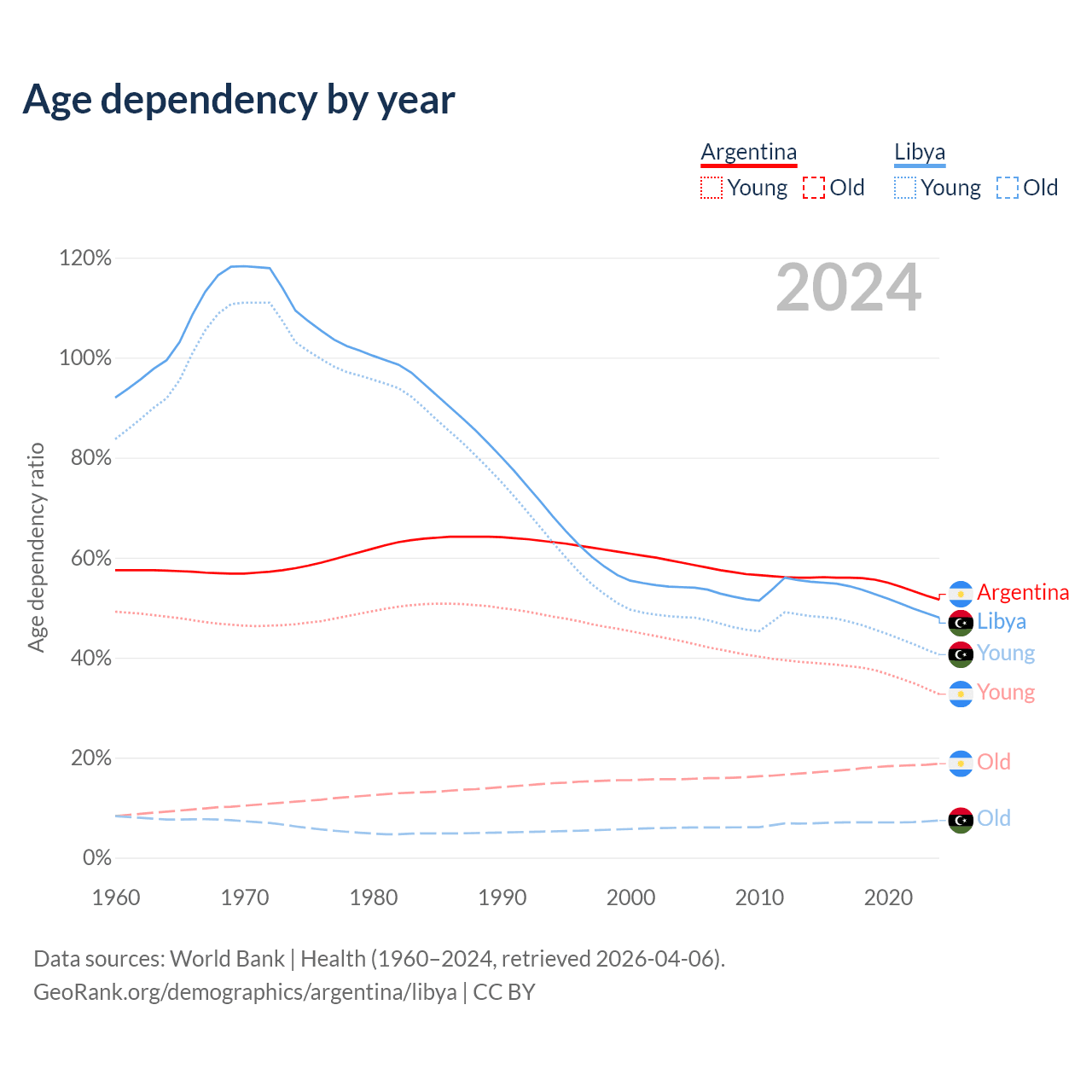 - The share of old-age demographic (65+) in Argentina is 12.4% vs 5.02% in Libya.