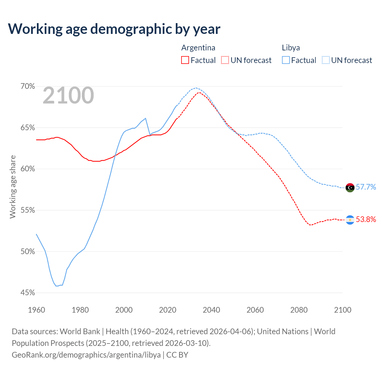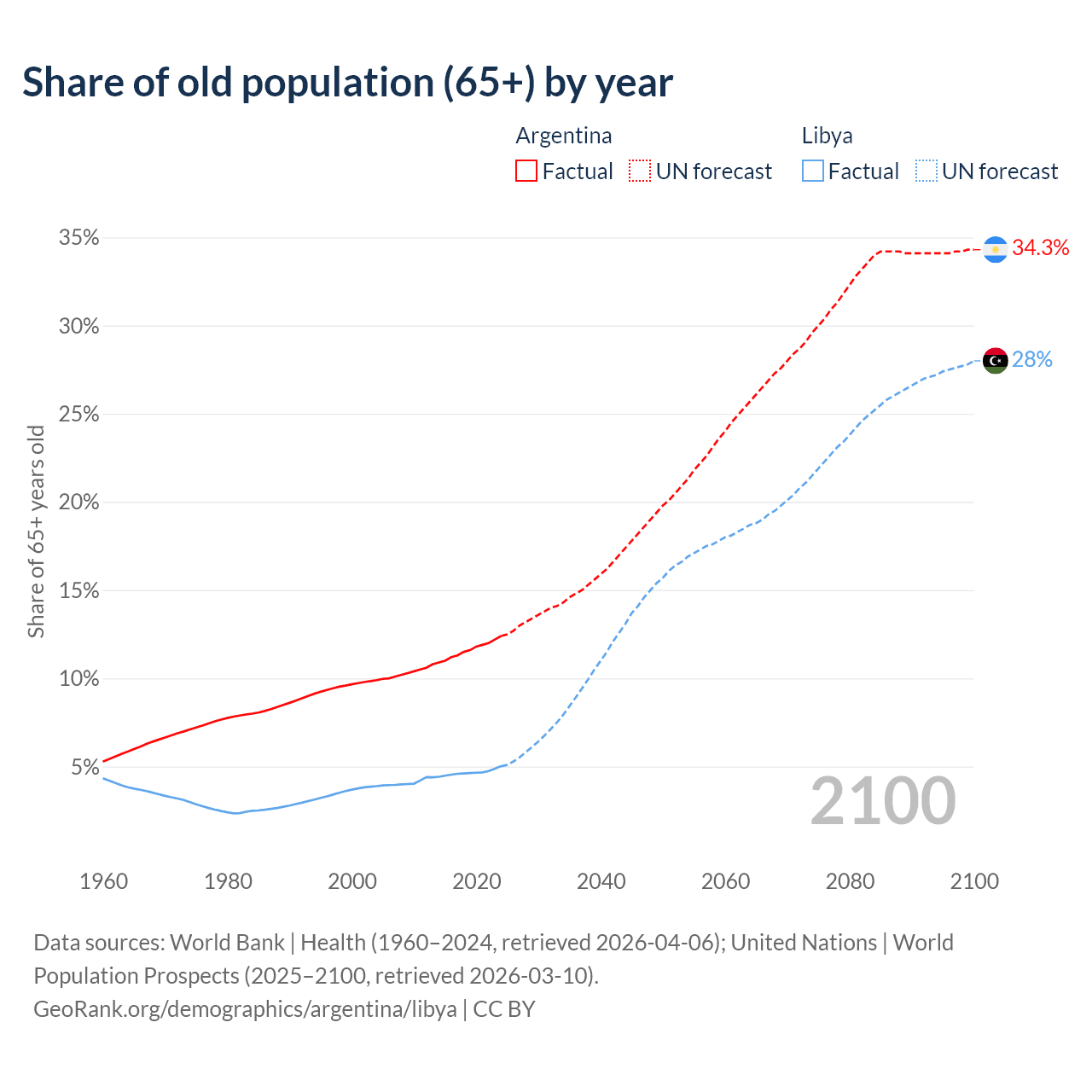 Median age Argentina vs Libya, 1960-2100