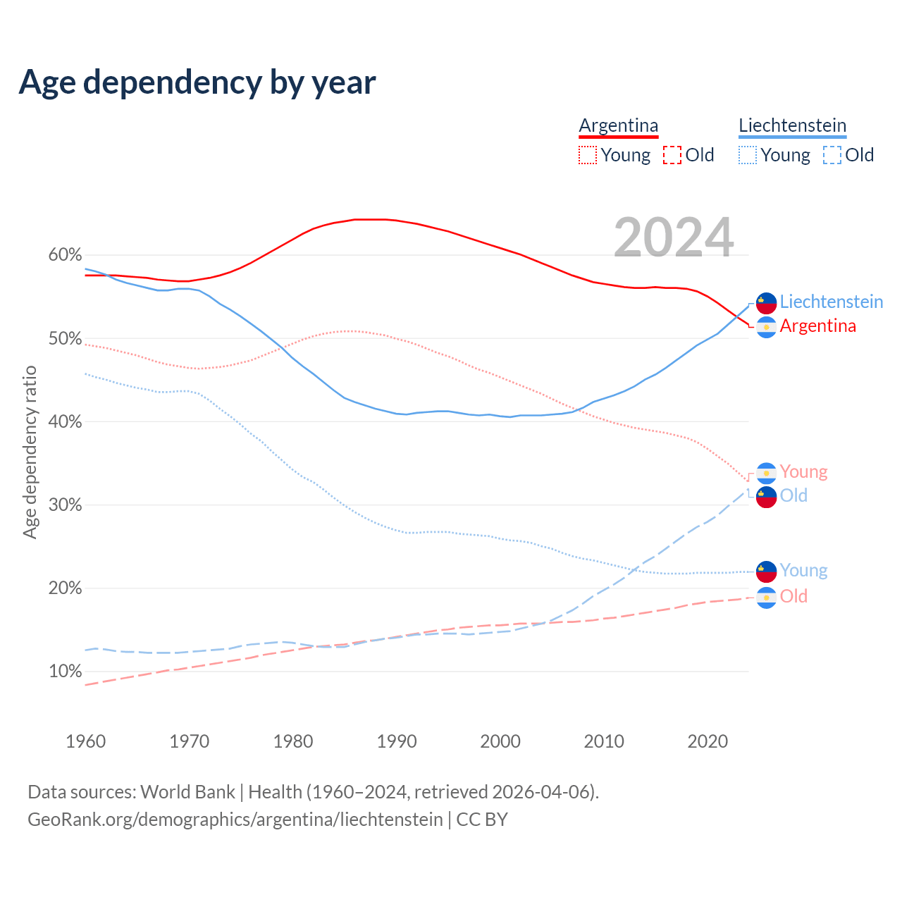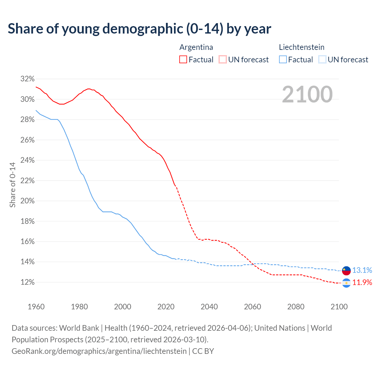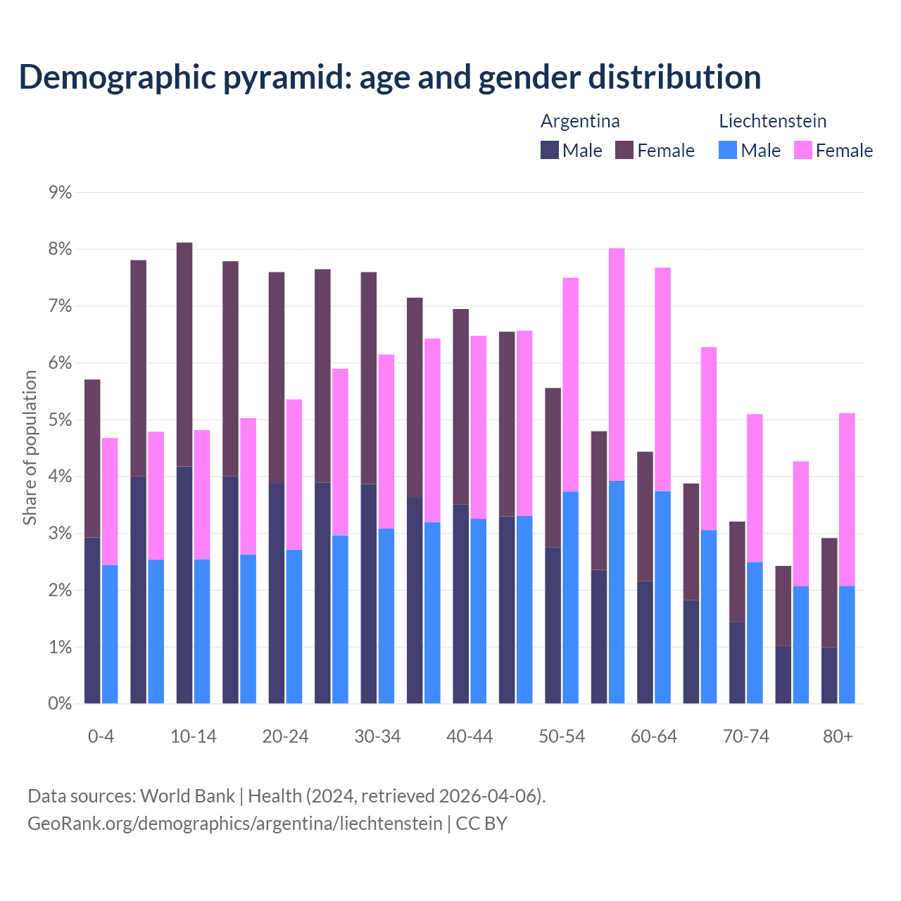 - The share of young demographic (0-15 years old) in Argentina is 21.6% vs 14.3% in Liechtenstein.