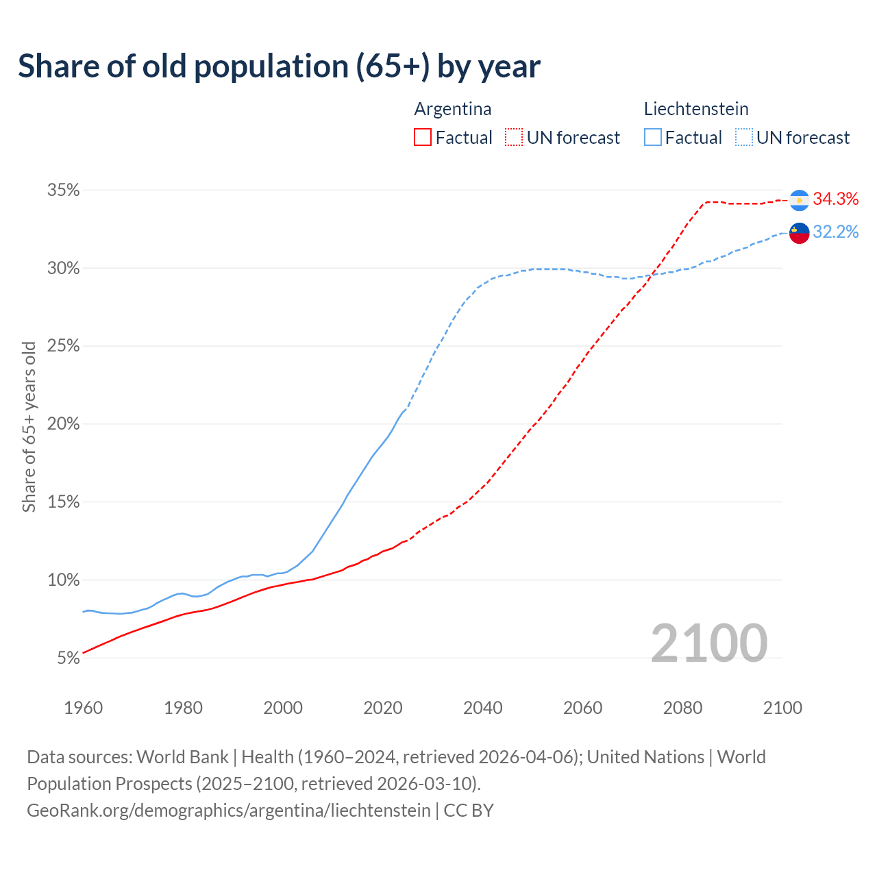 The share of older people aged 65 and over is 12.4% in Argentina and 20.7% in Liechtenstein. Life expectancy in Argentina compared to Liechtenstein .