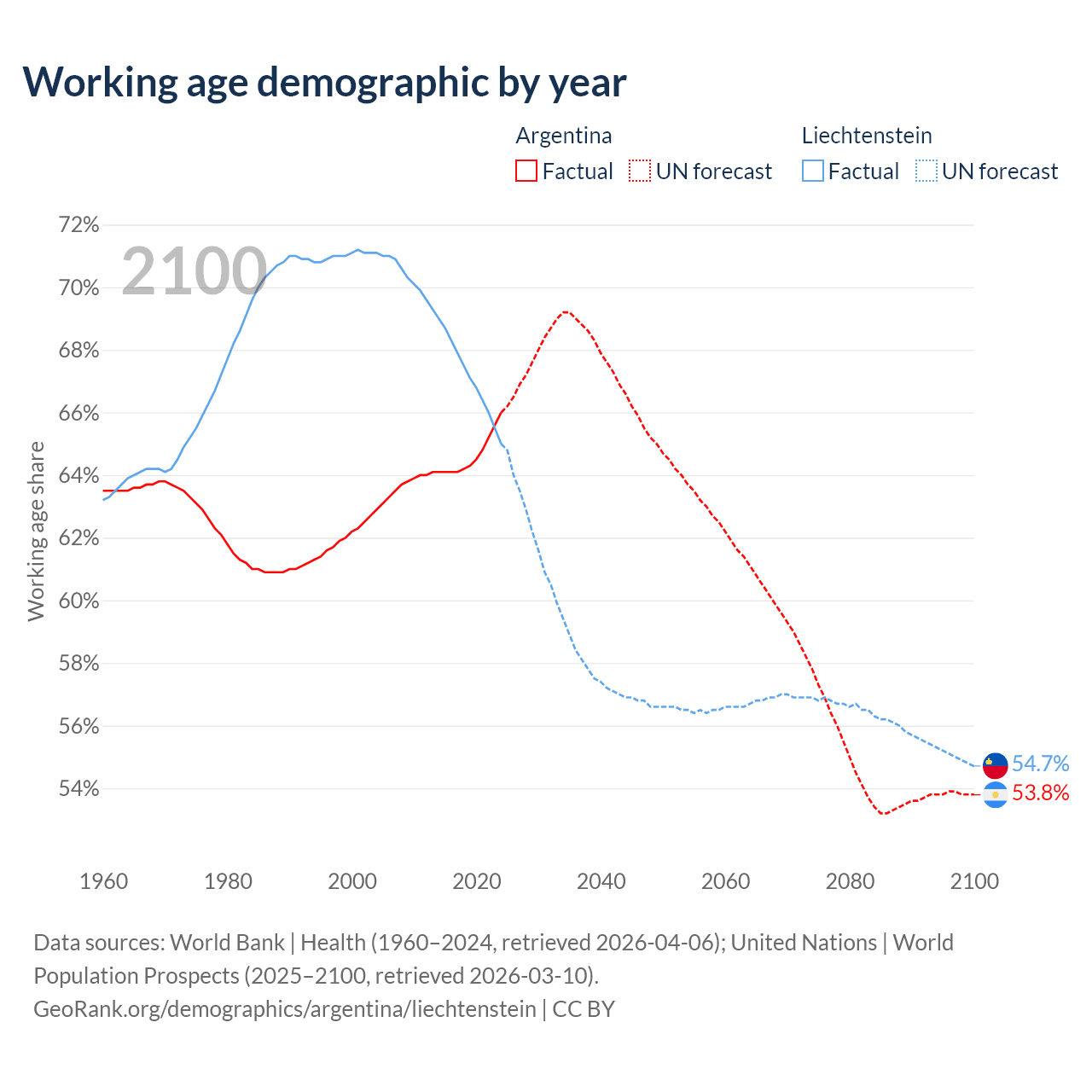 Median age Argentina vs Liechtenstein, 1960-2100
