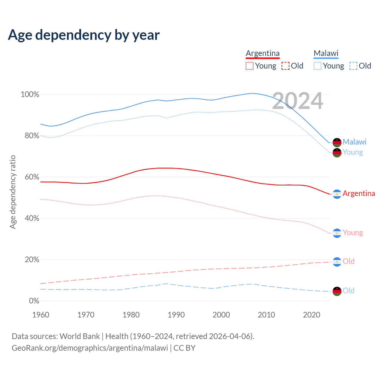 - Argentina is ranked 85/196 by median age (oldest to youngest) vs 181/196 for Malawi.
