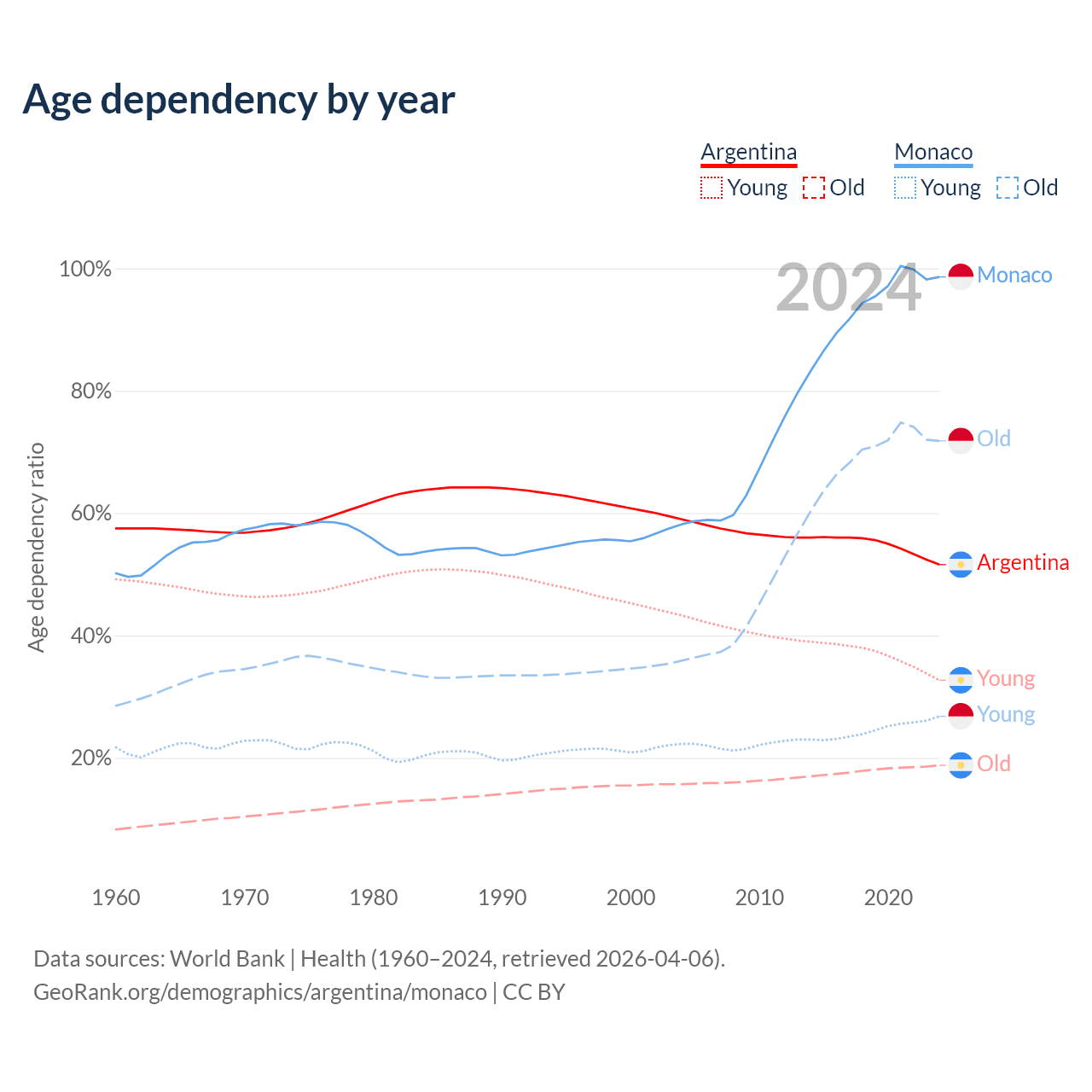- Argentina is ranked 85/196 by median age (oldest to youngest) vs 1/196 for Monaco.