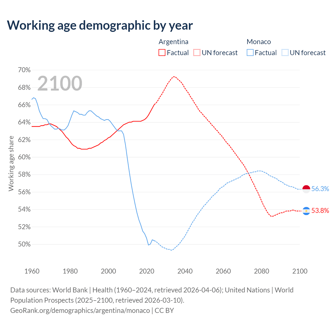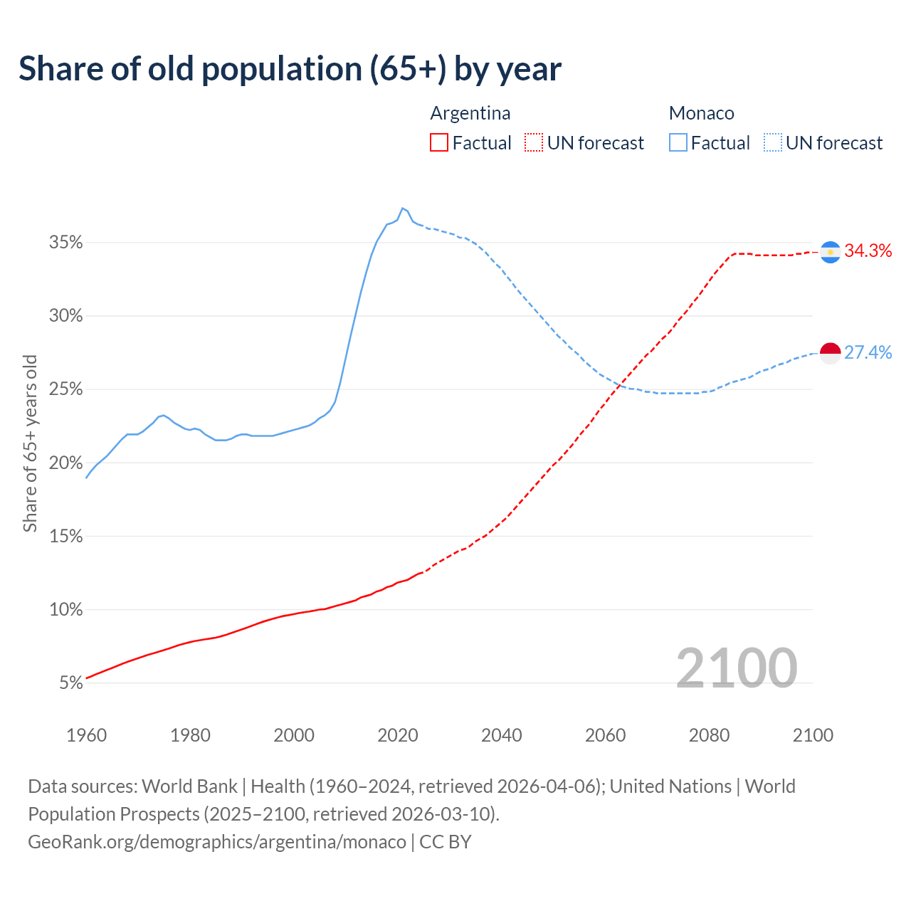 Median age Argentina vs Monaco, 1960-2100