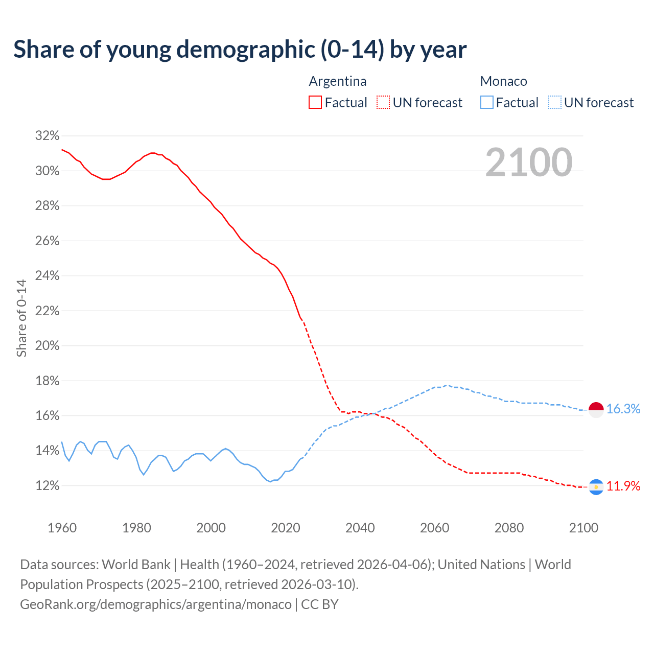 - The share of young demographic (0-15 years old) in Argentina is 21.6% vs 13.5% in Monaco.