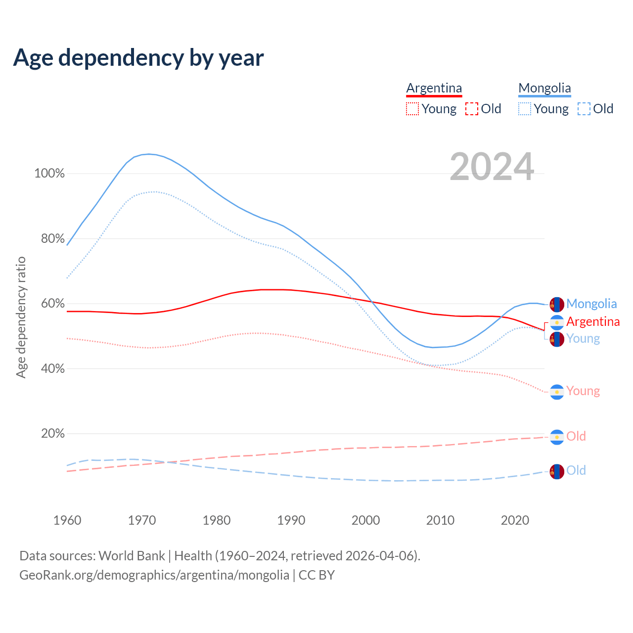 - Argentina is ranked 85/196 by median age (oldest to youngest) vs 117/196 for Mongolia.