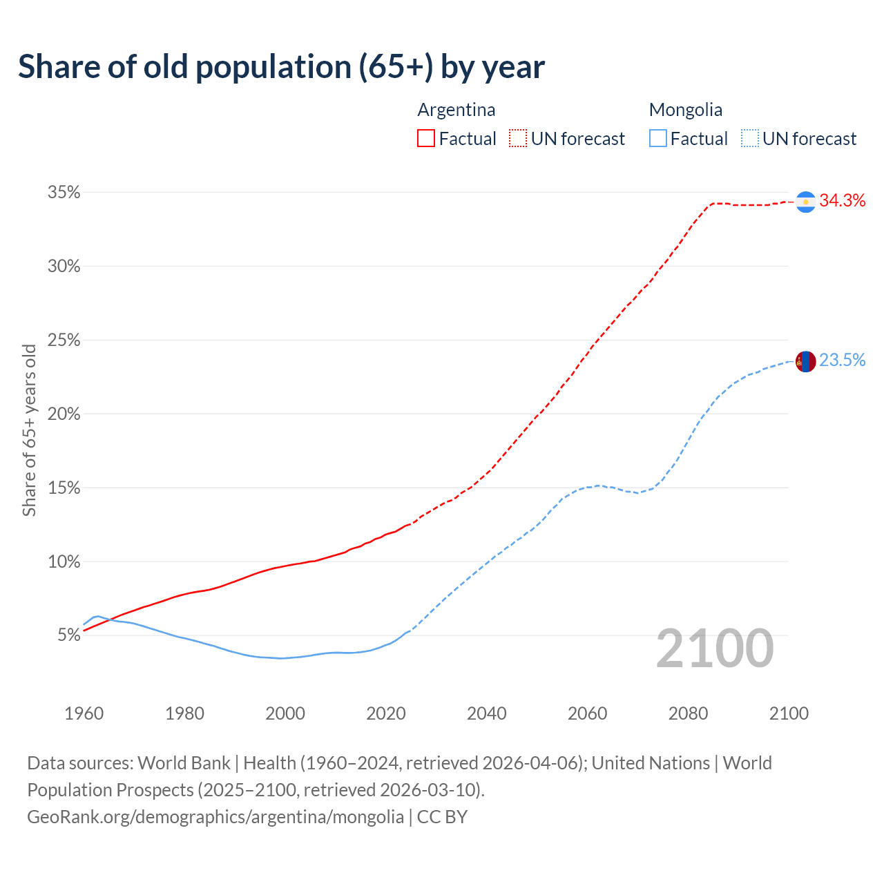 - The share of old-age demographic (65+) in Argentina is 12.4% vs 5.14% in Mongolia.
