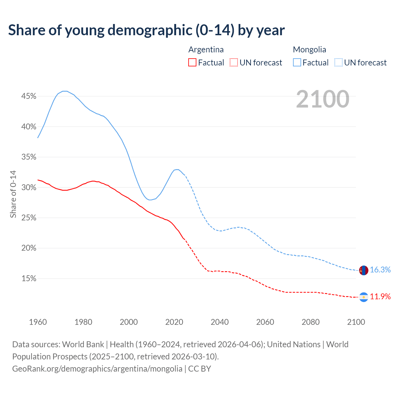 - As of 2026, the population of Argentina is 46M vs 3.62M in Mongolia - 12.7 times difference.