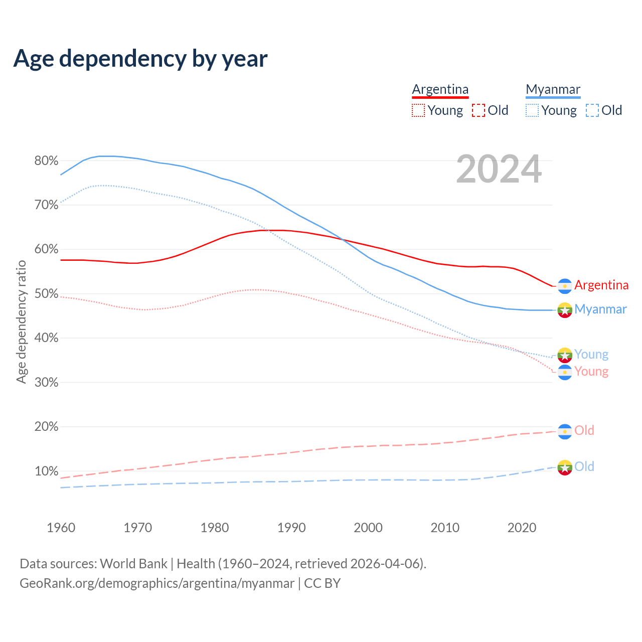 - Argentina is ranked 85/196 by median age (oldest to youngest) vs 96/196 for Myanmar.