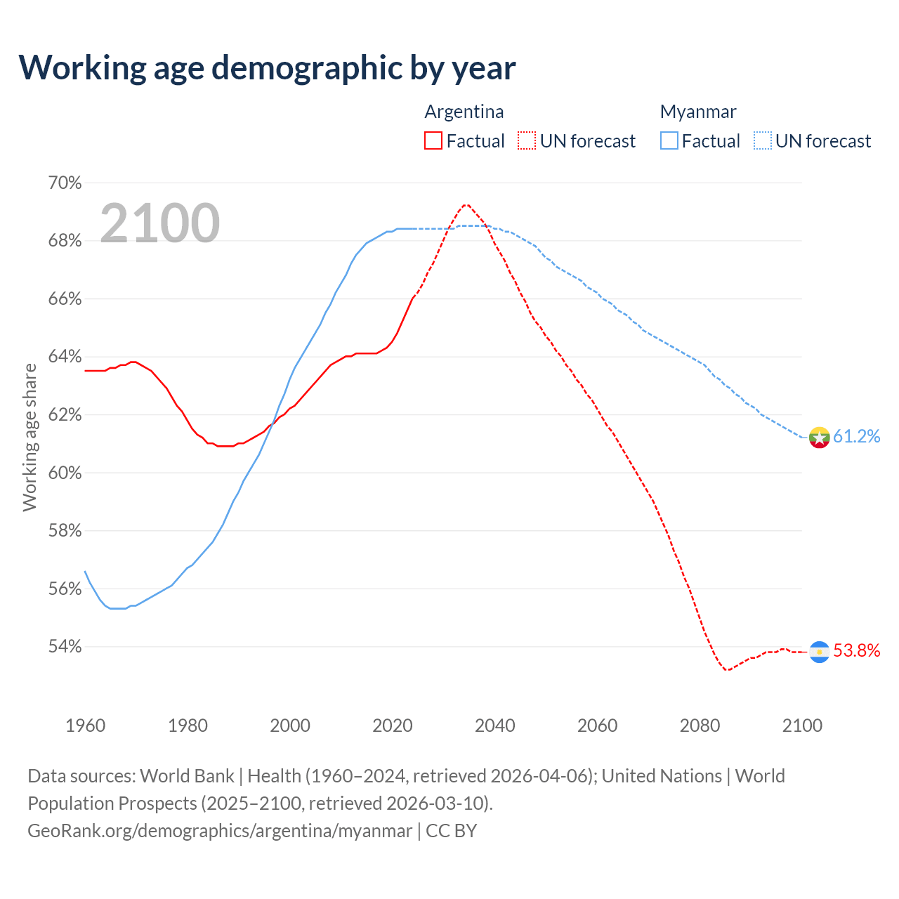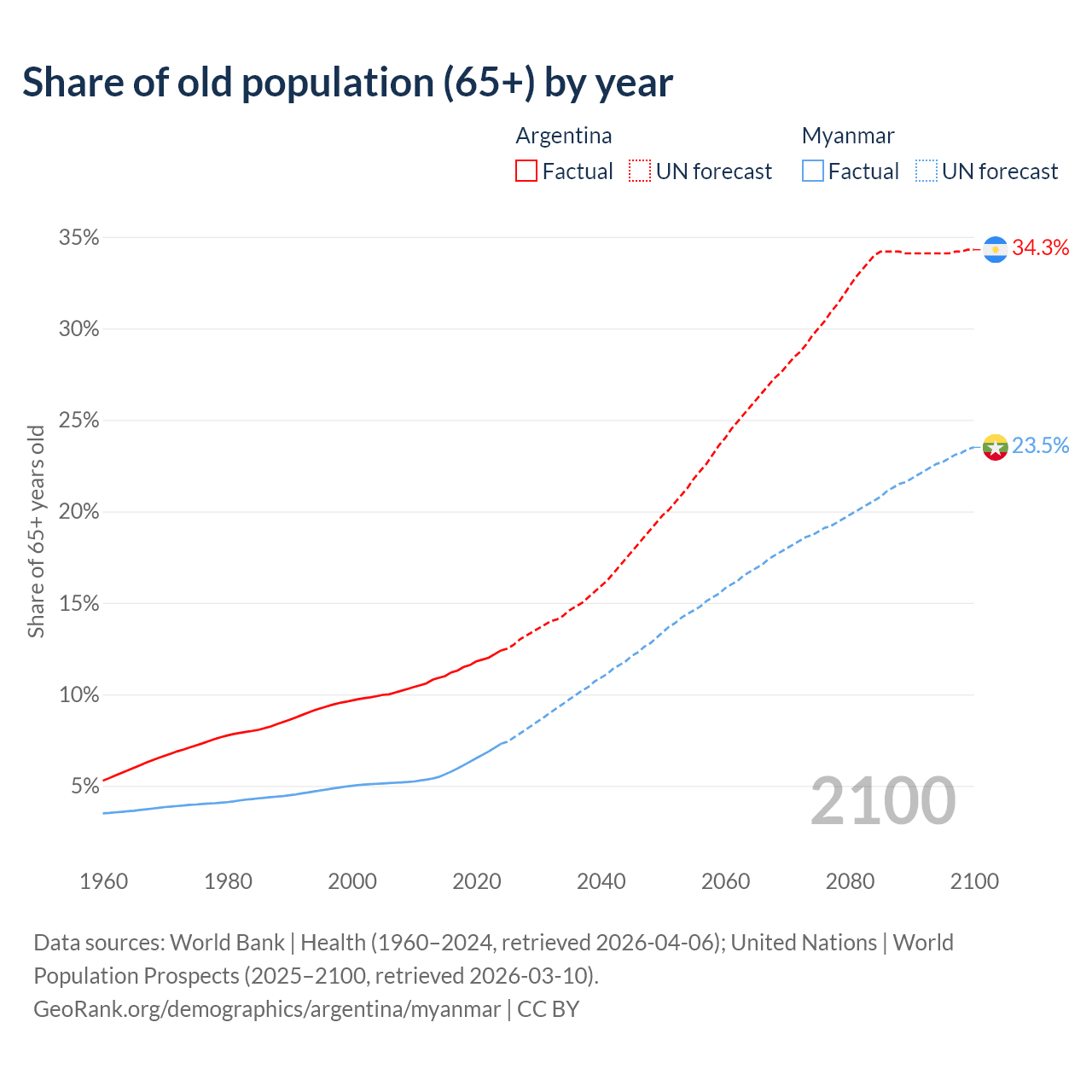 Median age Argentina vs Myanmar, 1960-2100