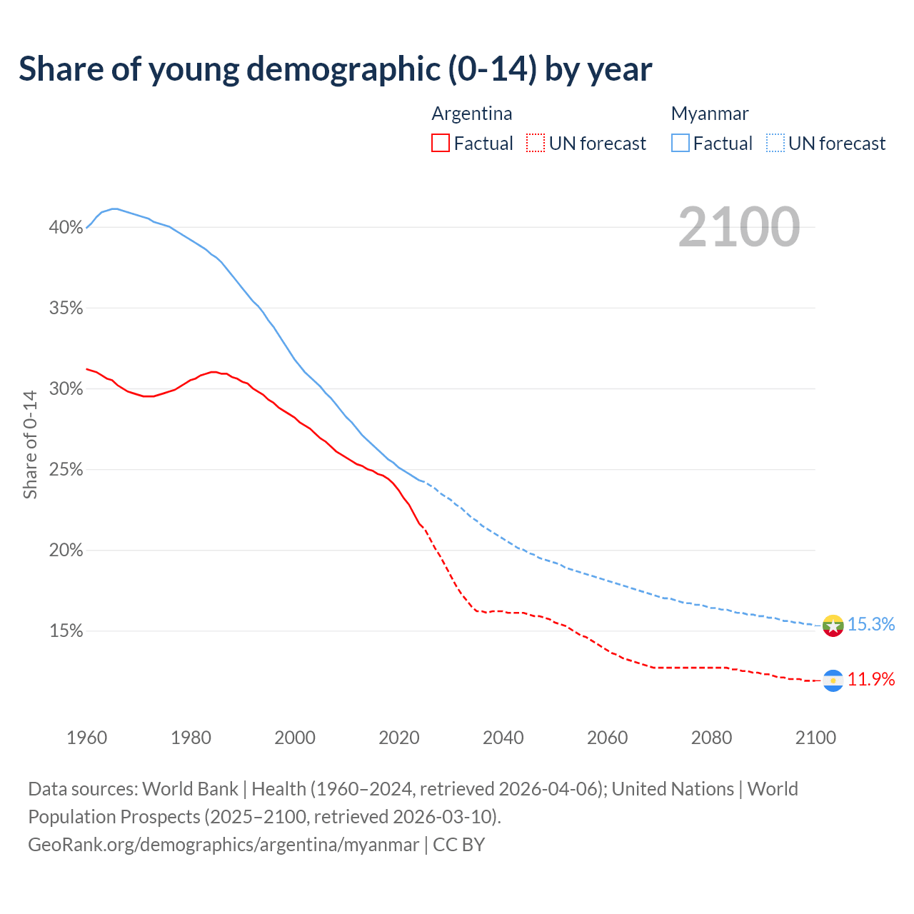 - The share of young demographic (0-15 years old) in Argentina is 21.6% vs 24.3% in Myanmar.