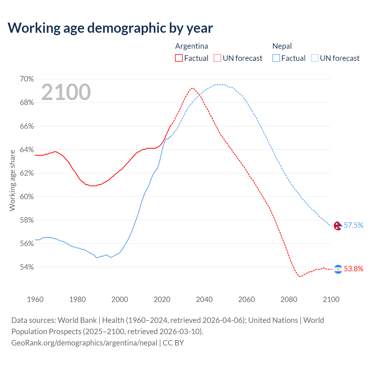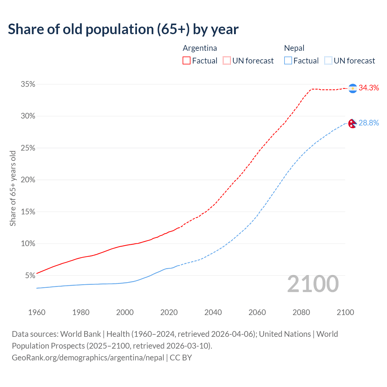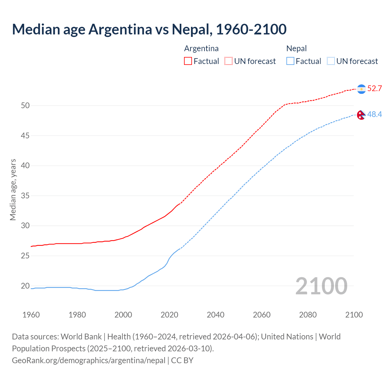 Median age Argentina vs Nepal, 1960-2100