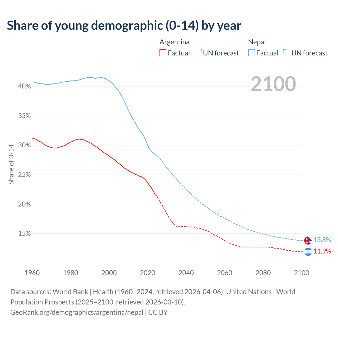 - The share of young demographic (0-15 years old) in Argentina is 21.6% vs 28.4% in Nepal.