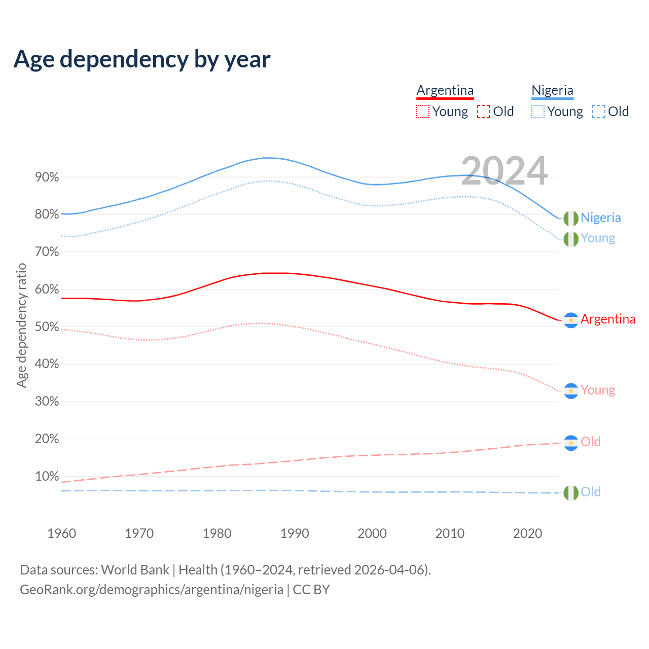 - Argentina is ranked 85/196 by median age (oldest to youngest) vs 178/196 for Nigeria.