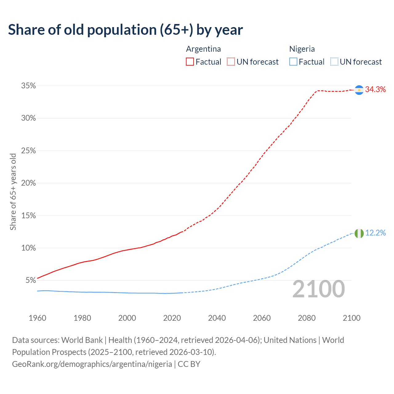 The share of older people aged 65 and over is 12.4% in Argentina and 3.05% in Nigeria. Life expectancy in Argentina compared to Nigeria .