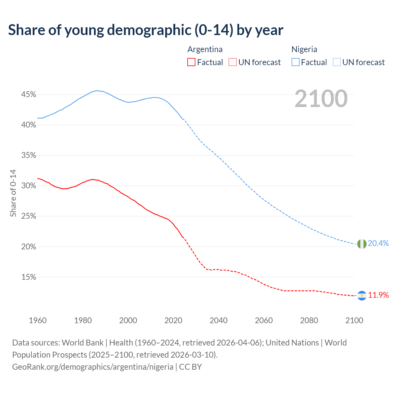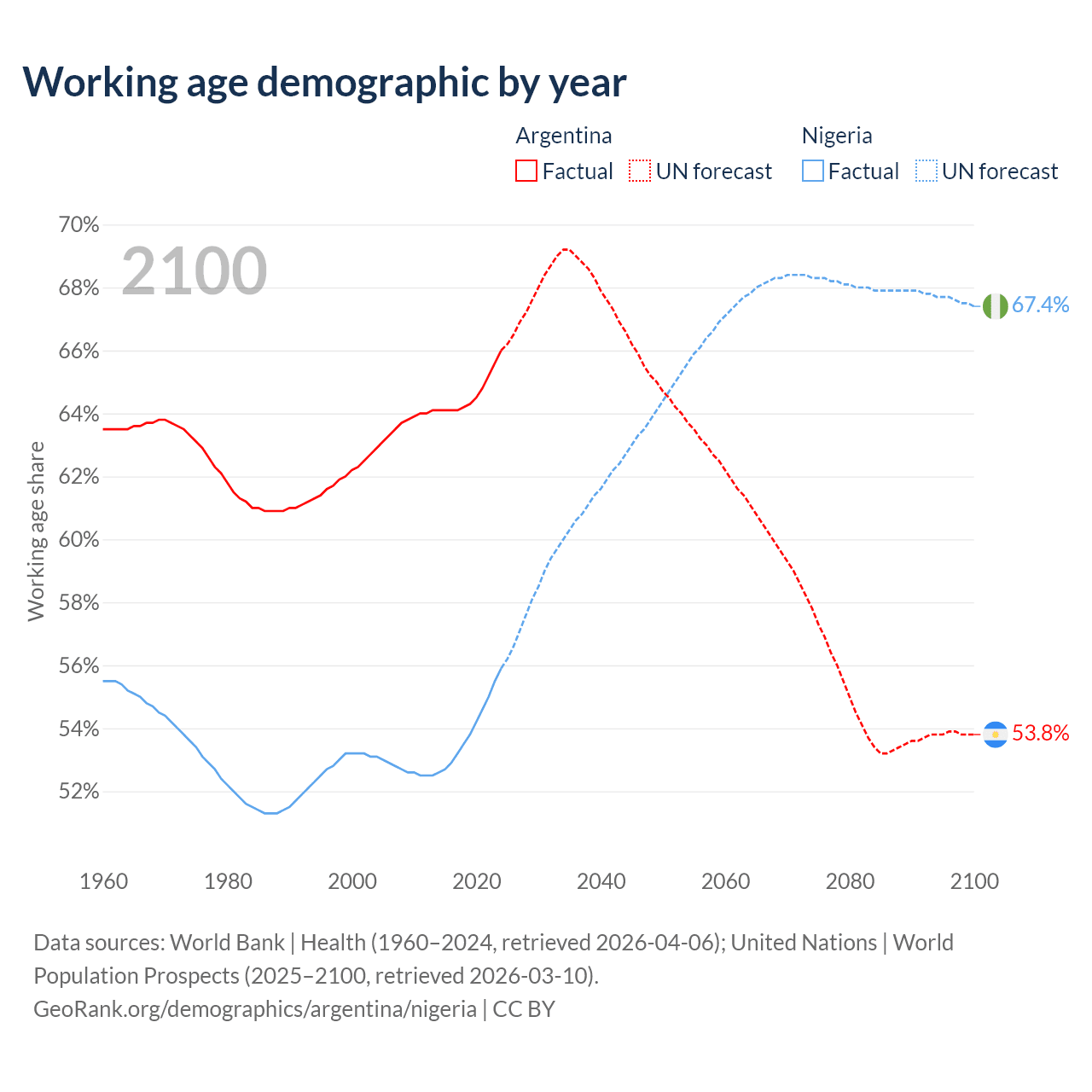 Median age Argentina vs Nigeria, 1960-2100