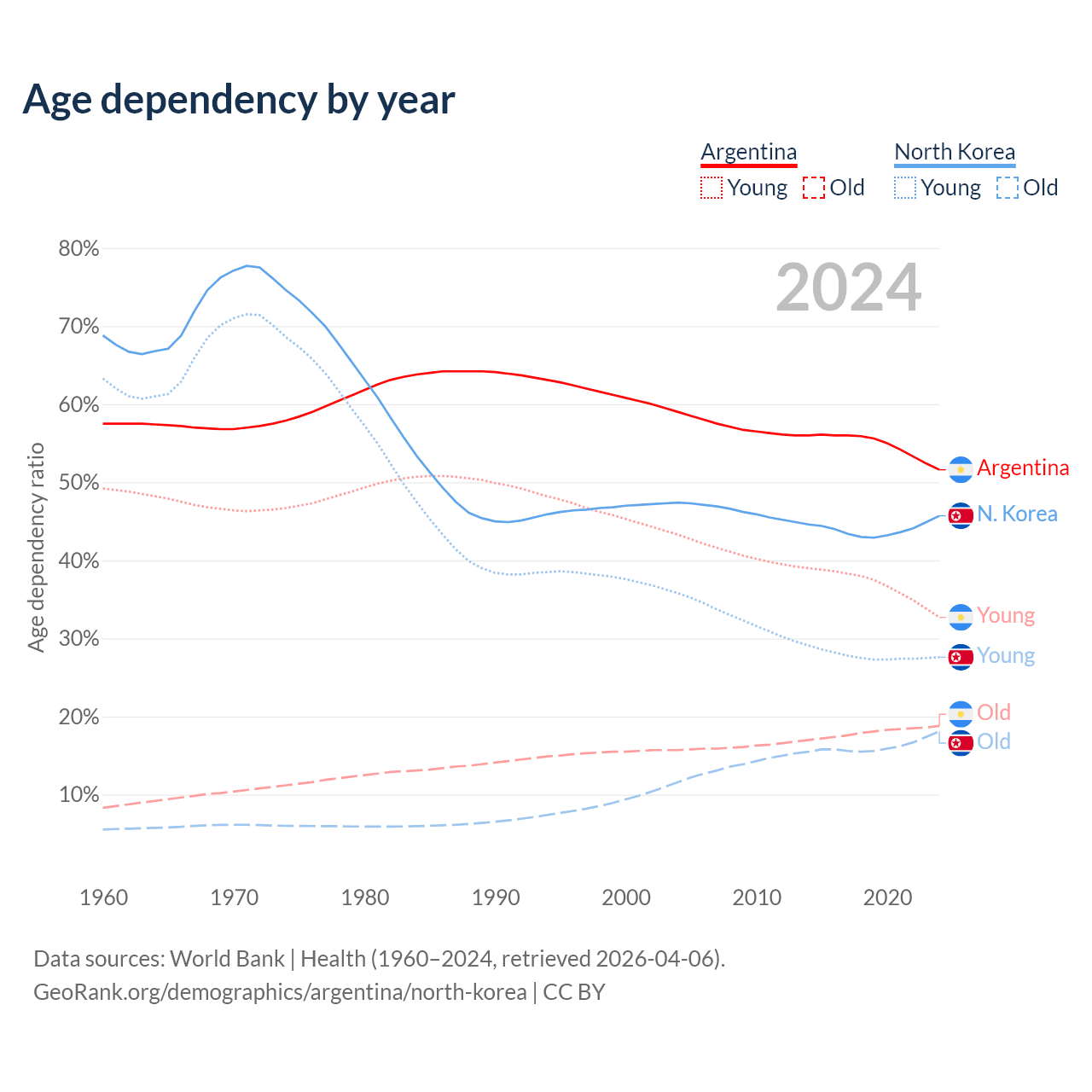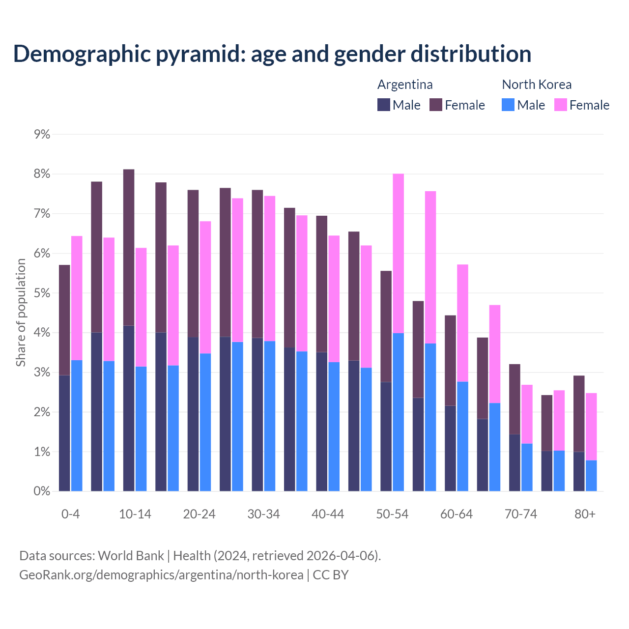 - Argentina is ranked 85/196 by median age (oldest to youngest) vs 62/196 for North Korea.
