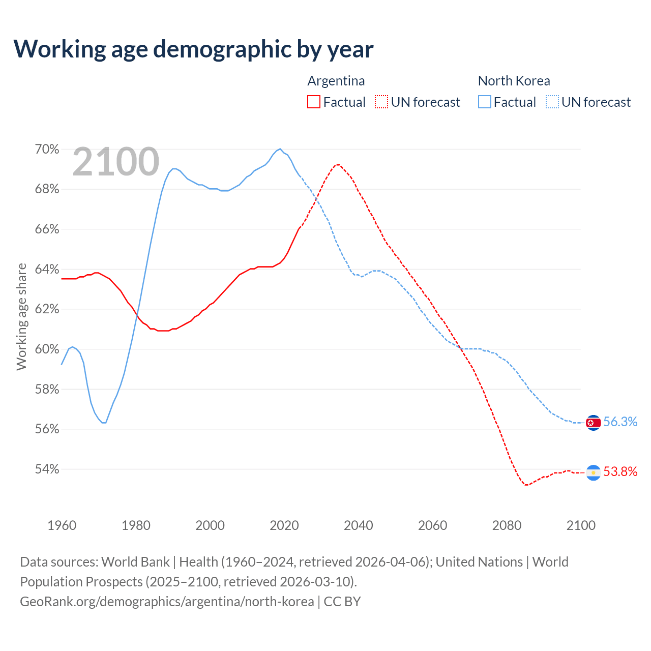 - Argentina has 30.4M working age adults (aged 15-64) vs 18.3M in North Korea.
