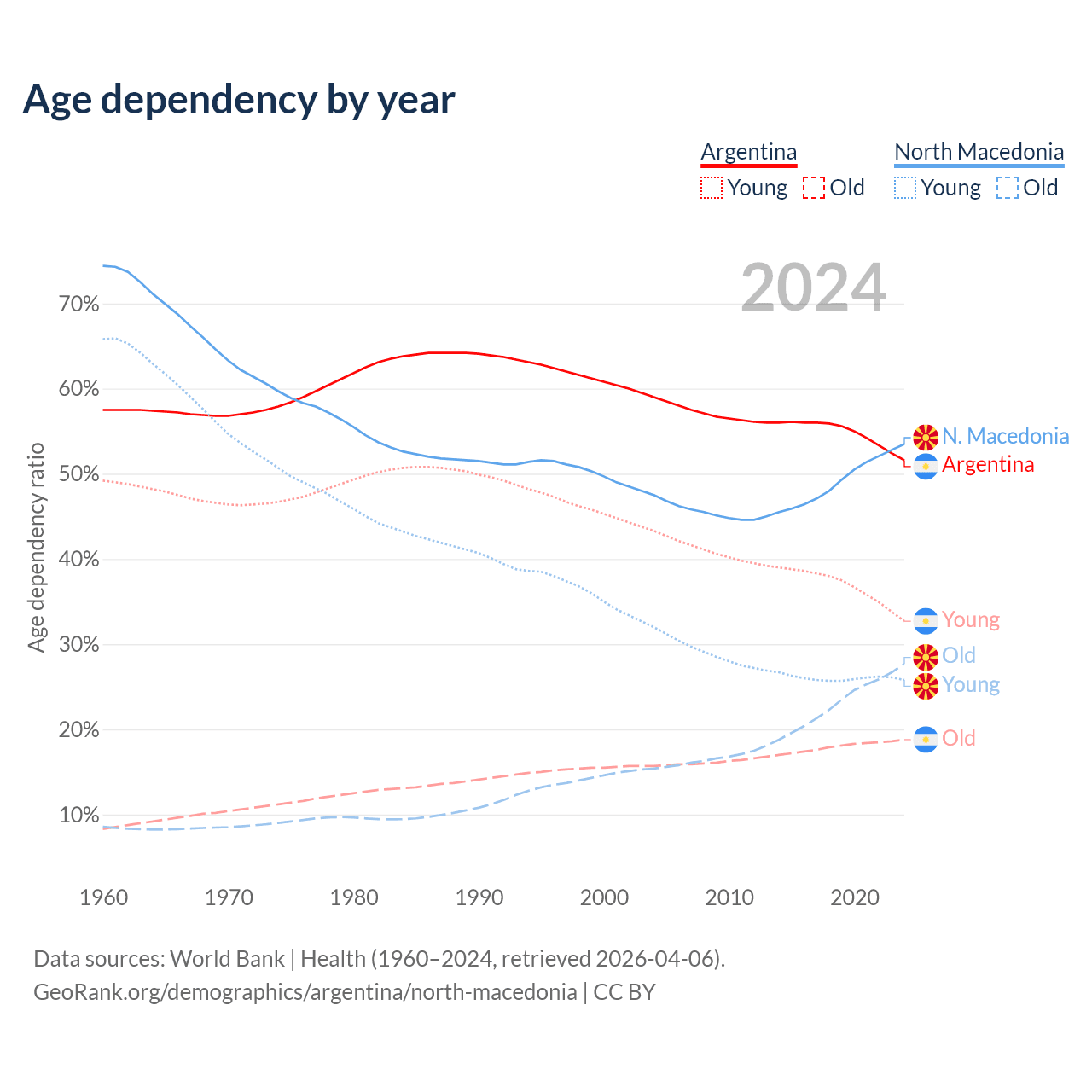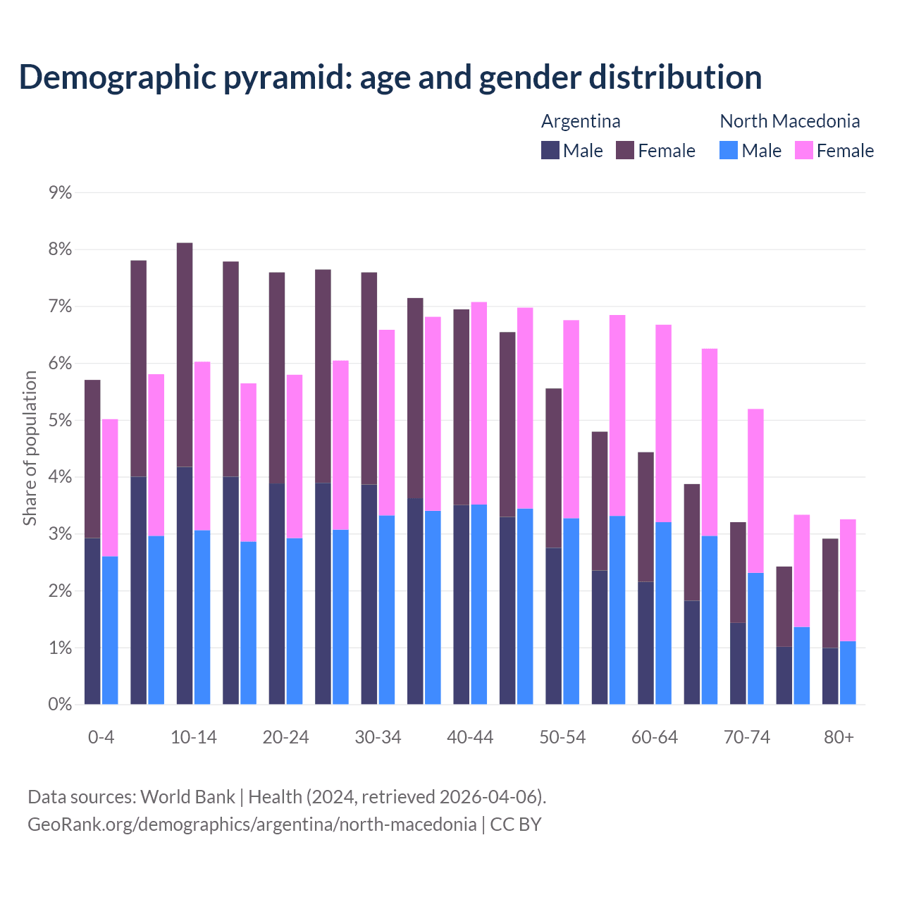 - Argentina is ranked 85/196 by median age (oldest to youngest) vs 37/196 for North Macedonia.