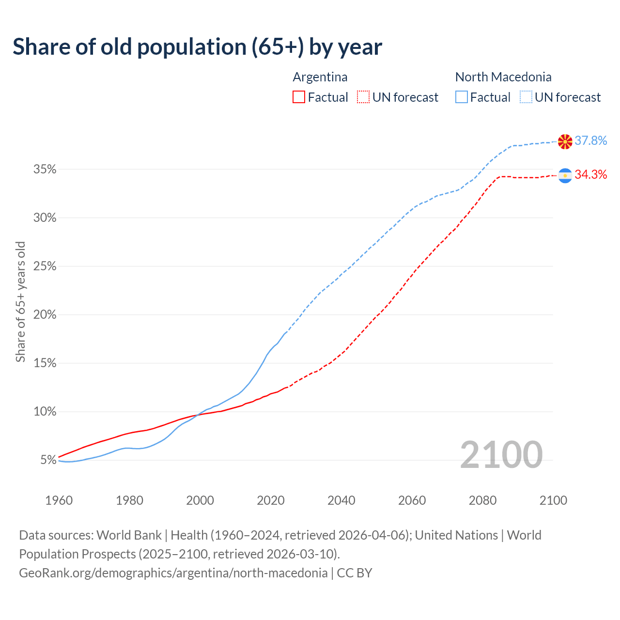 The share of older people aged 65 and over is 12.4% in Argentina and 18% in North Macedonia. Life expectancy in Argentina compared to North Macedonia .