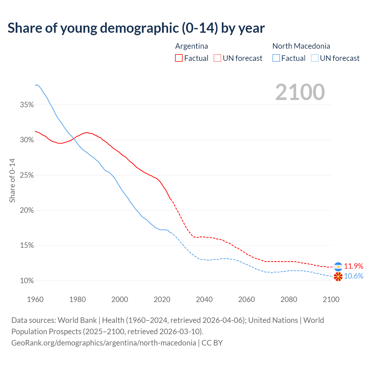 - The share of young demographic (0-15 years old) in Argentina is 21.6% vs 16.8% in North Macedonia.
