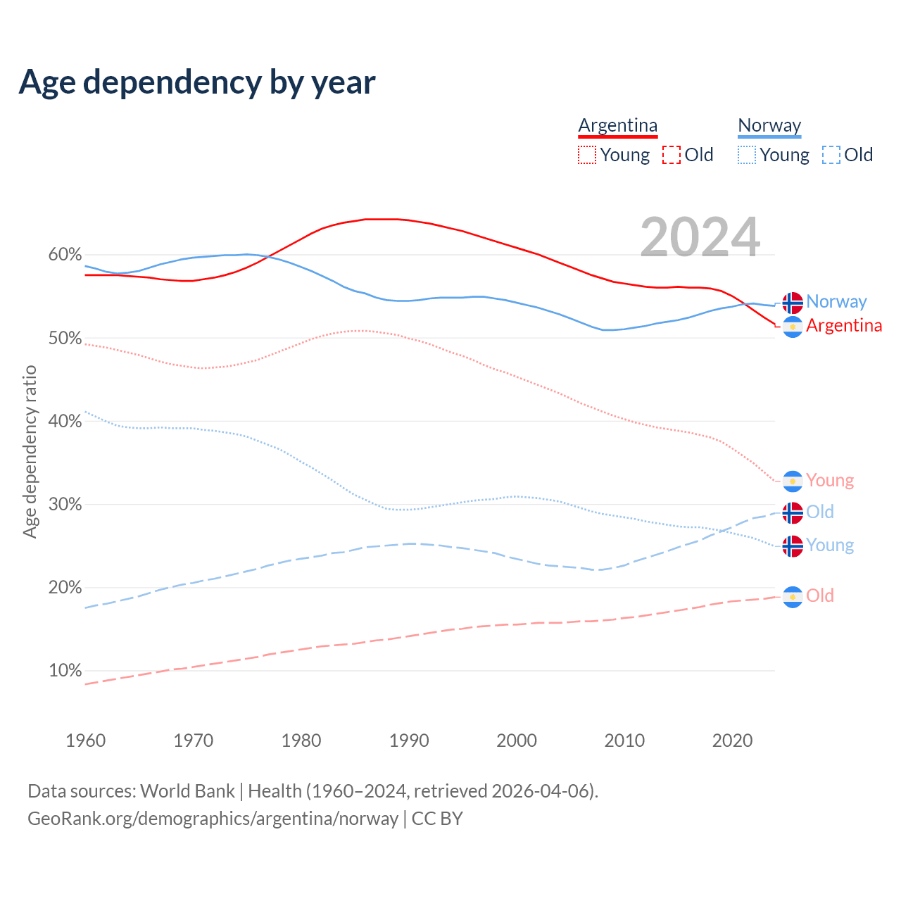 - Argentina is ranked 85/196 by median age (oldest to youngest) vs 43/196 for Norway.