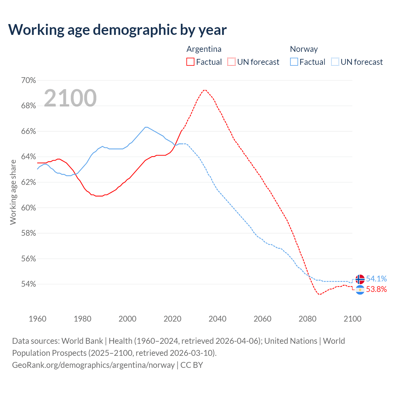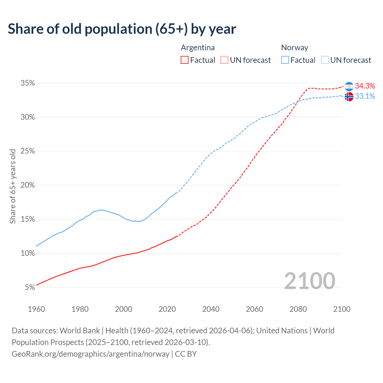 Median age Argentina vs Norway, 1960-2100