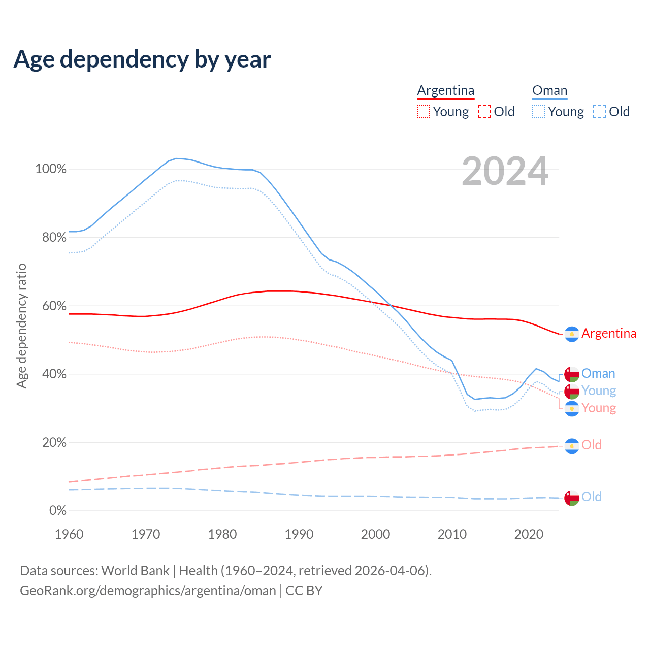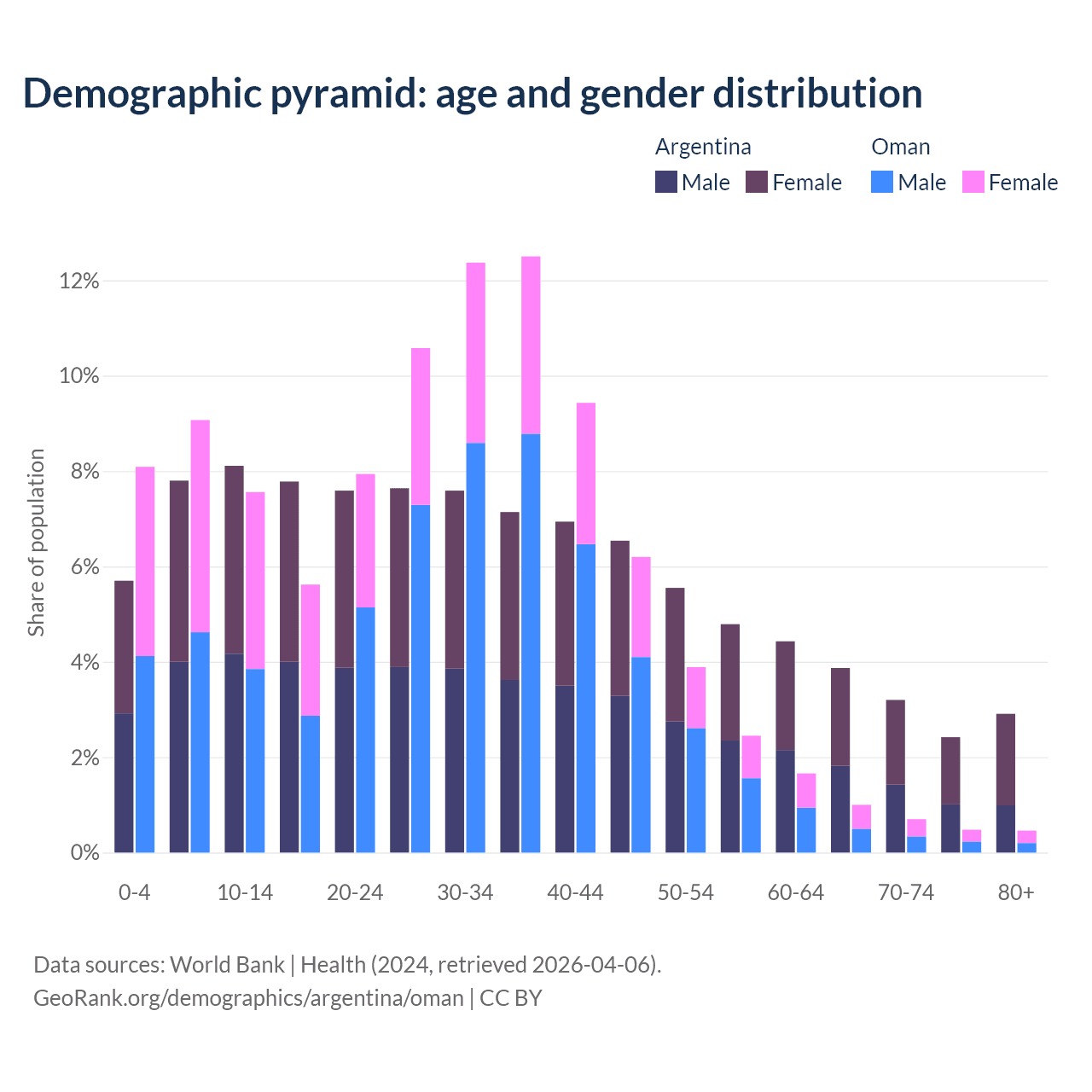 - Argentina is ranked 85/196 by median age (oldest to youngest) vs 101/196 for Oman.