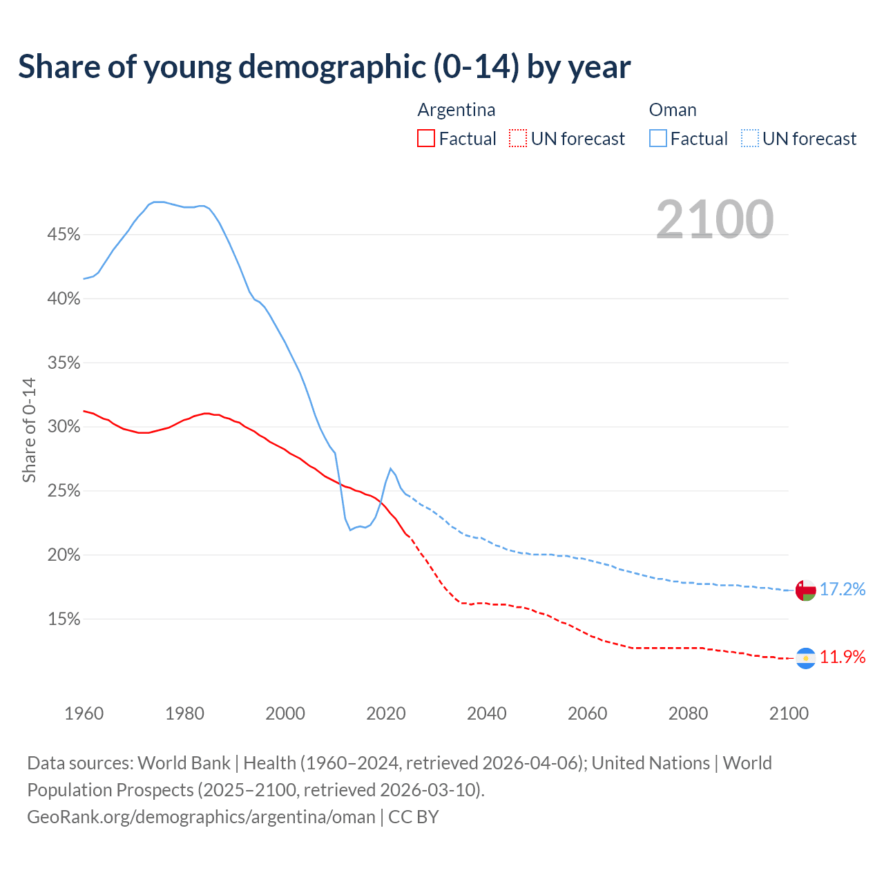 - The share of young demographic (0-15 years old) in Argentina is 21.6% vs 24.7% in Oman.