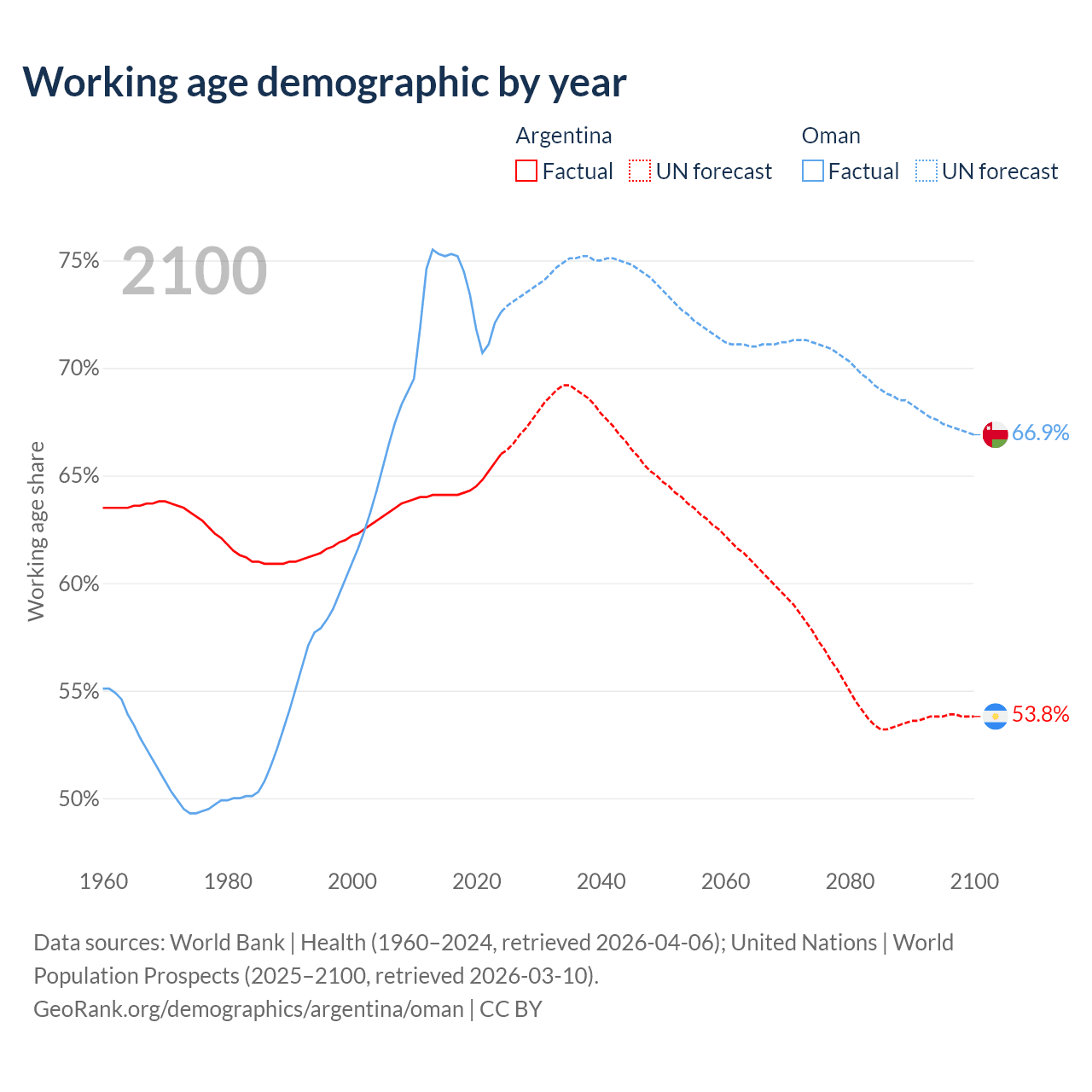 - Argentina has 30.4M working age adults (aged 15-64) vs 4.19M in Oman.