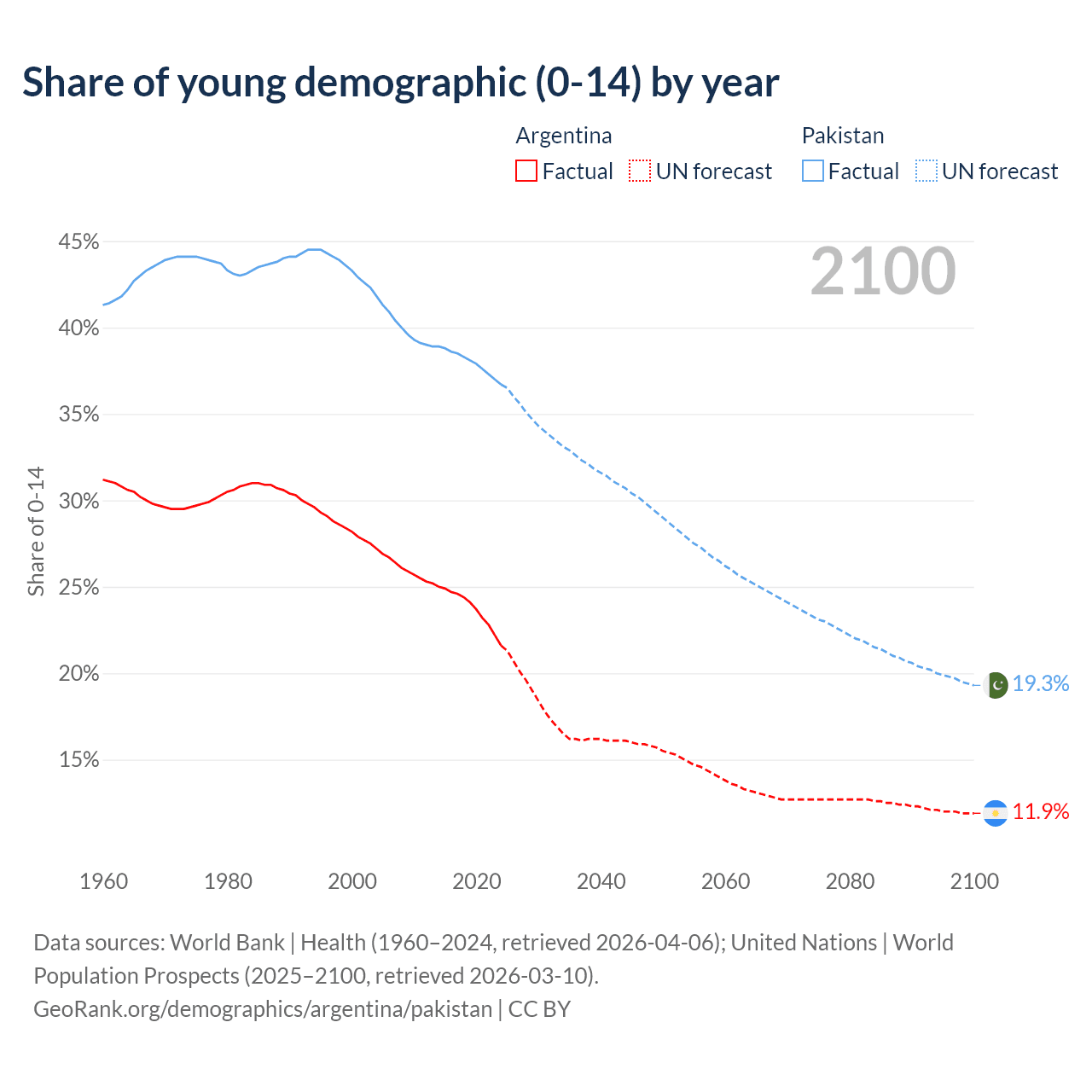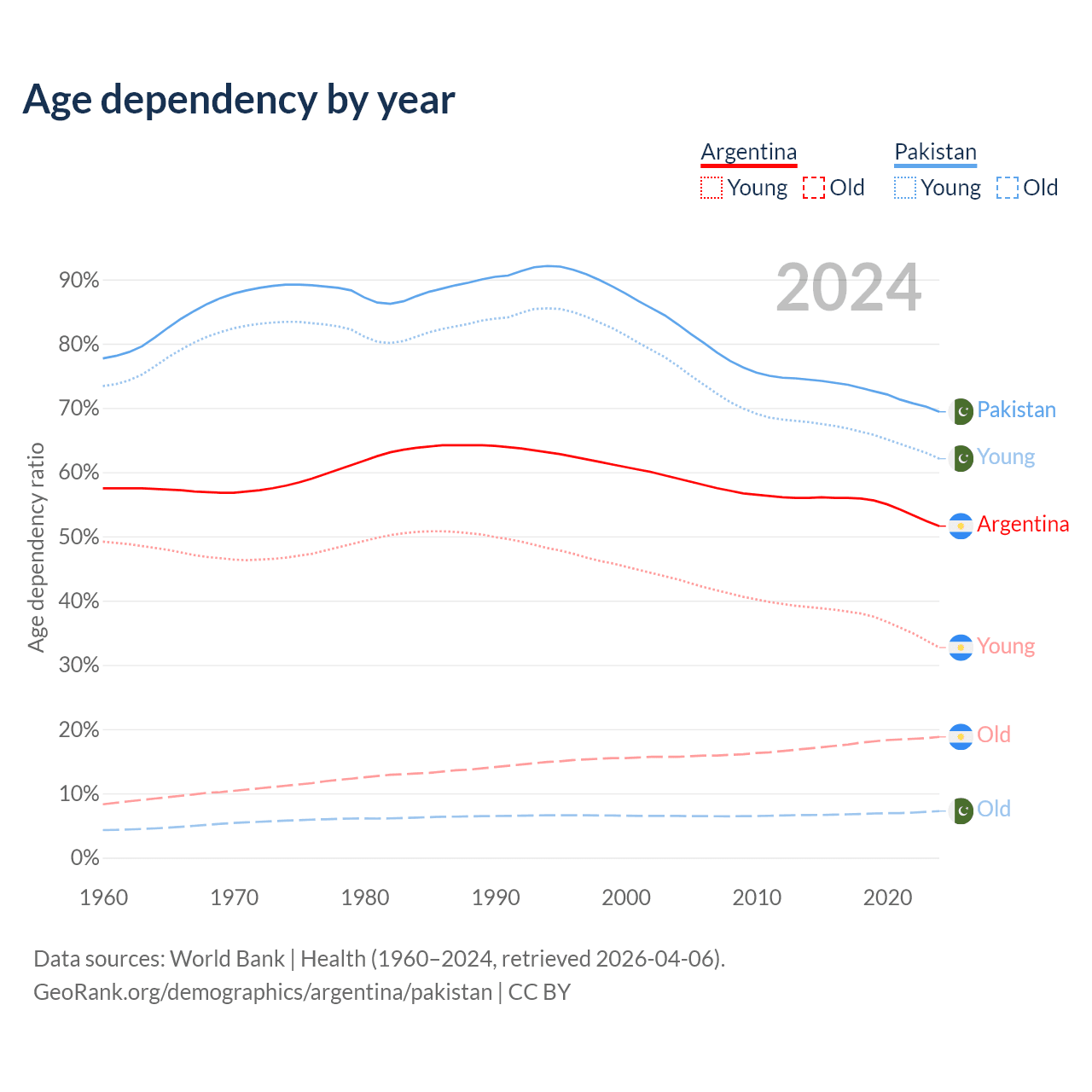 - Argentina is ranked 85/196 by median age (oldest to youngest) vs 154/196 for Pakistan.