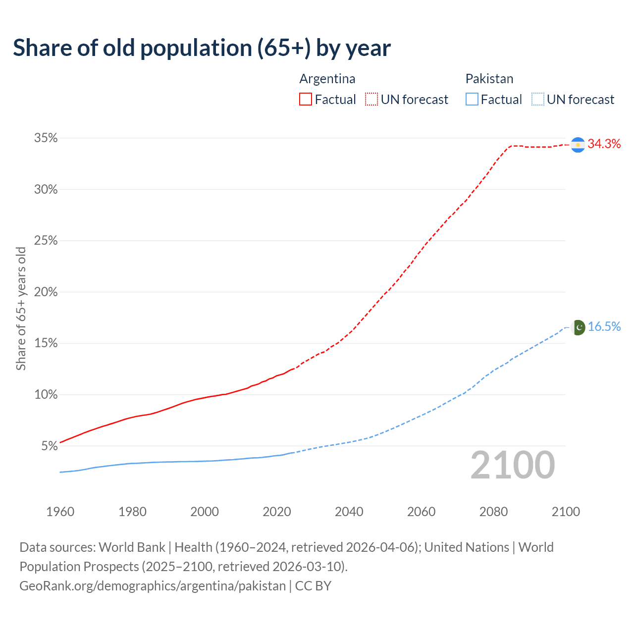 The share of older people aged 65 and over is 12.4% in Argentina and 4.28% in Pakistan. Life expectancy in Argentina compared to Pakistan .