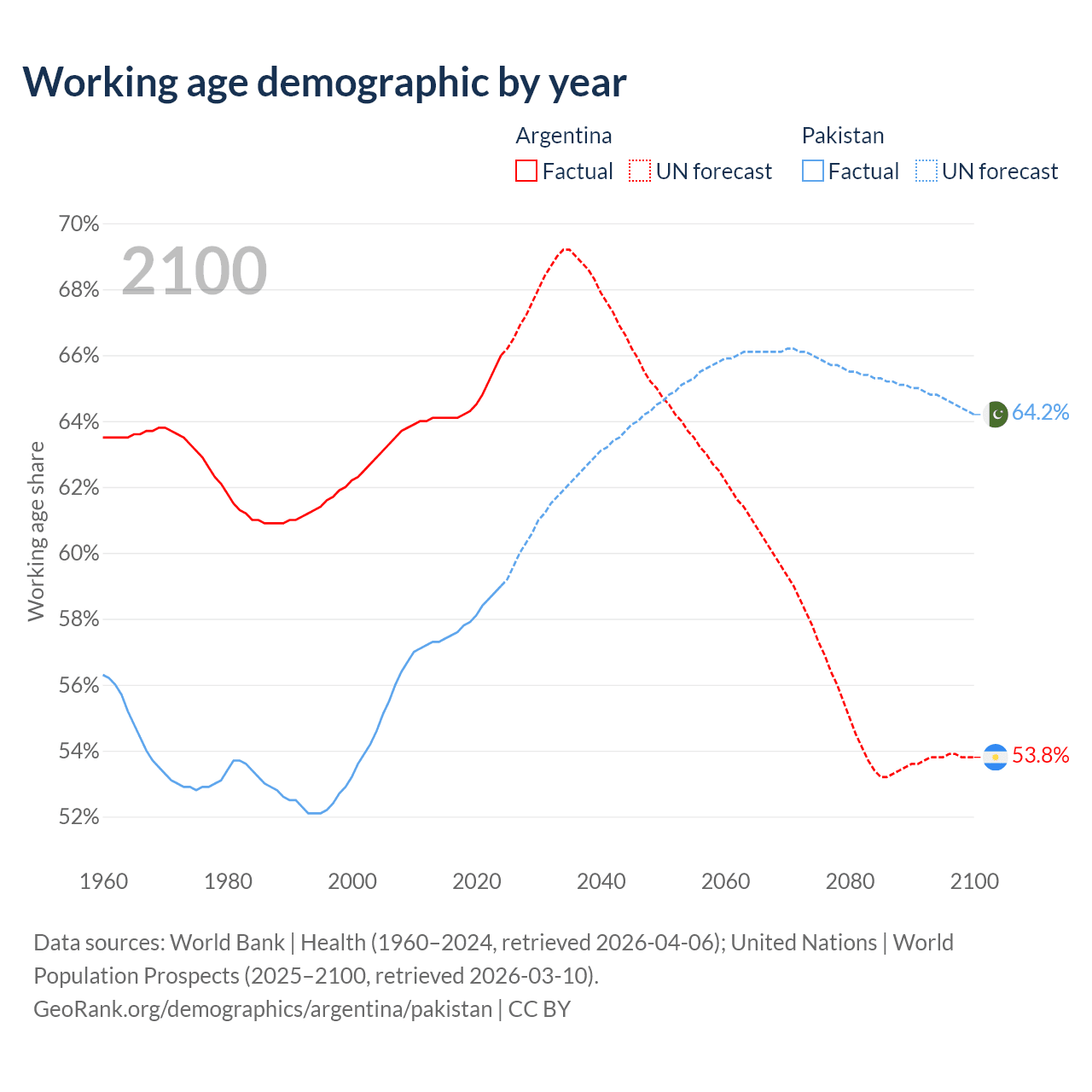 - Argentina has 30.4M working age adults (aged 15-64) vs 154M in Pakistan.