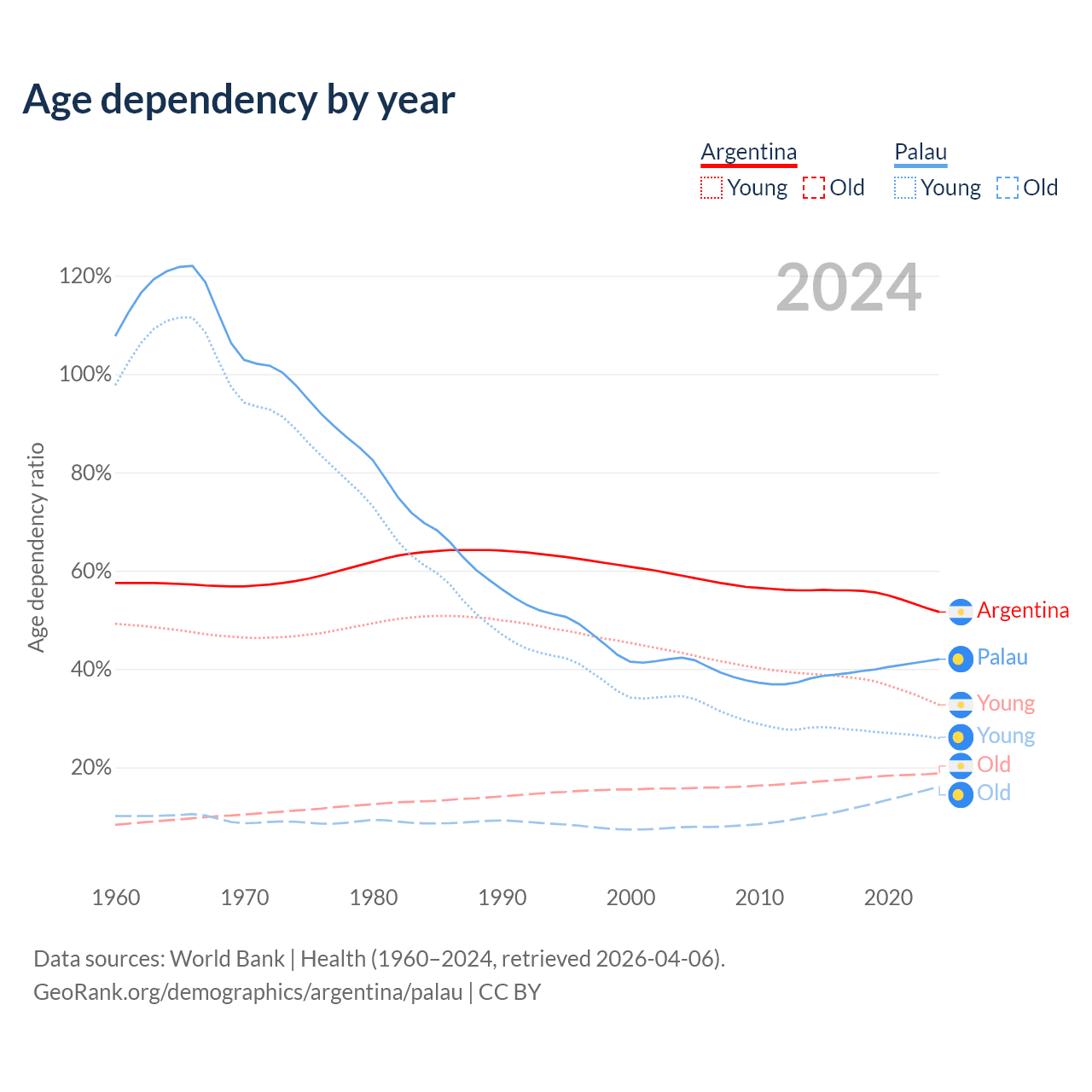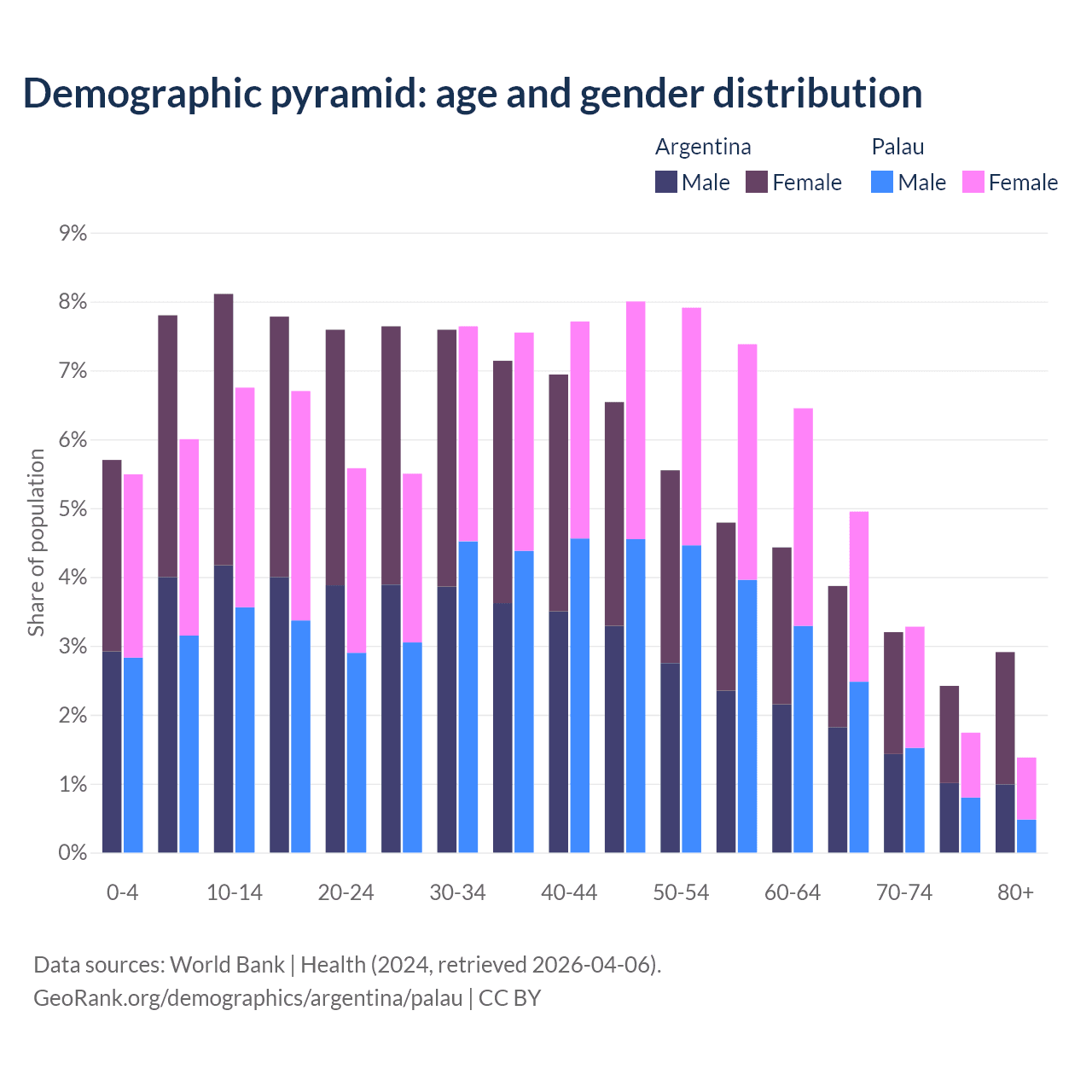 - Argentina is ranked 85/196 by median age (oldest to youngest) vs 53/196 for Palau.