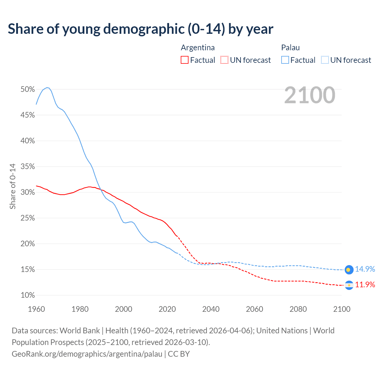 - The share of young demographic (0-15 years old) in Argentina is 21.6% vs 18.2% in Palau.