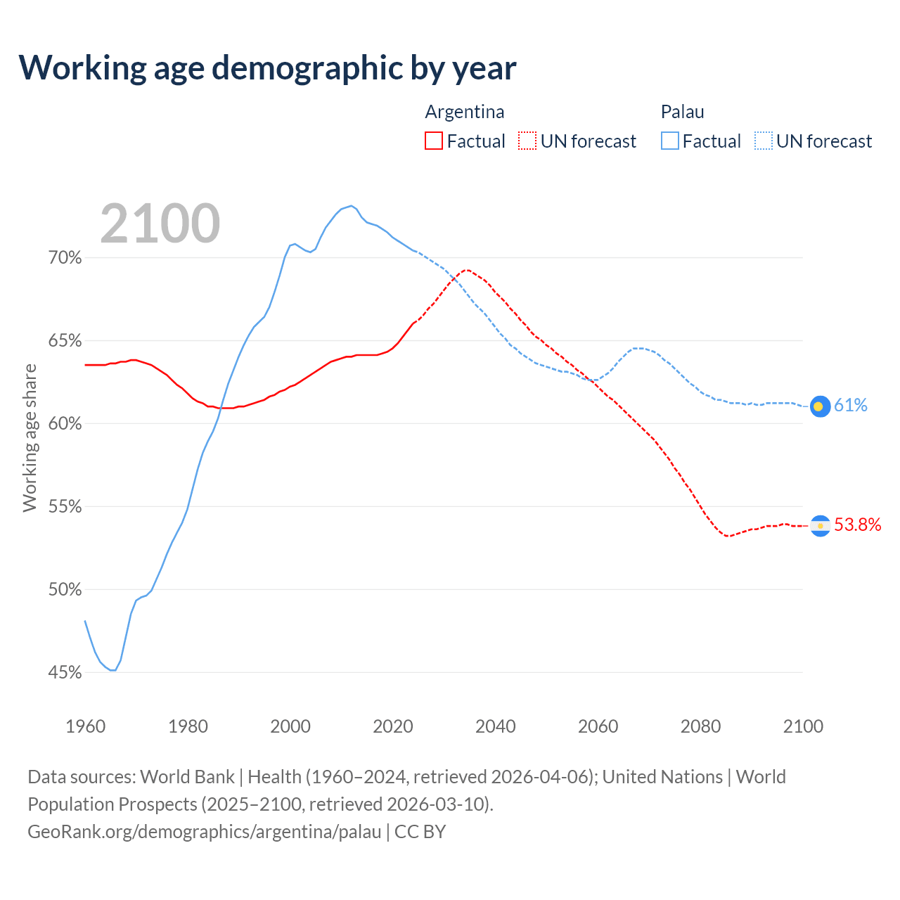 - Argentina has 30.4M working age adults (aged 15-64) vs 12.4K in Palau.