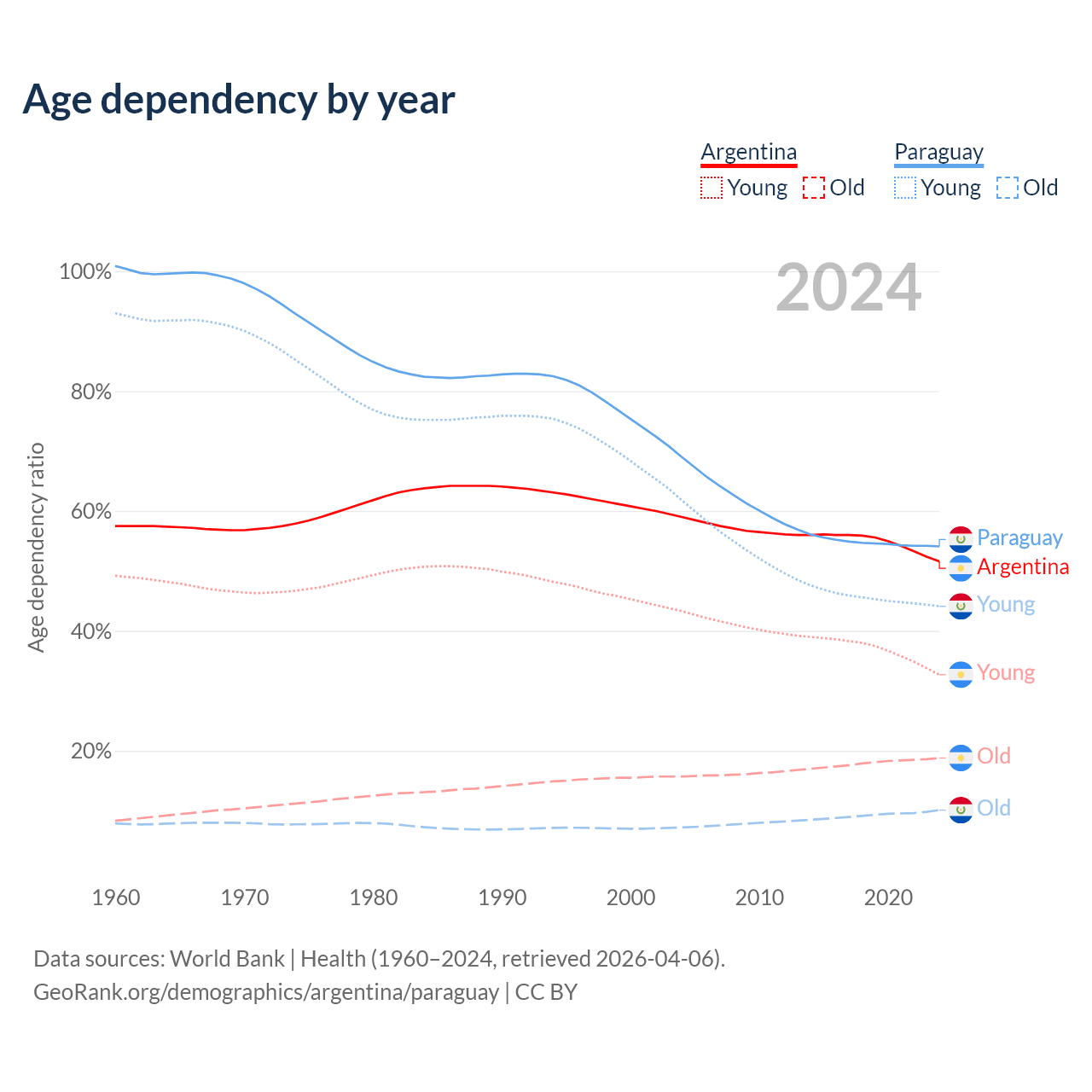 Data sources: World Bank | Health (1960–2024, retrieved 2026-04-06); U.S. Census Bureau (1960–2024, retrieved 2026-02-08).