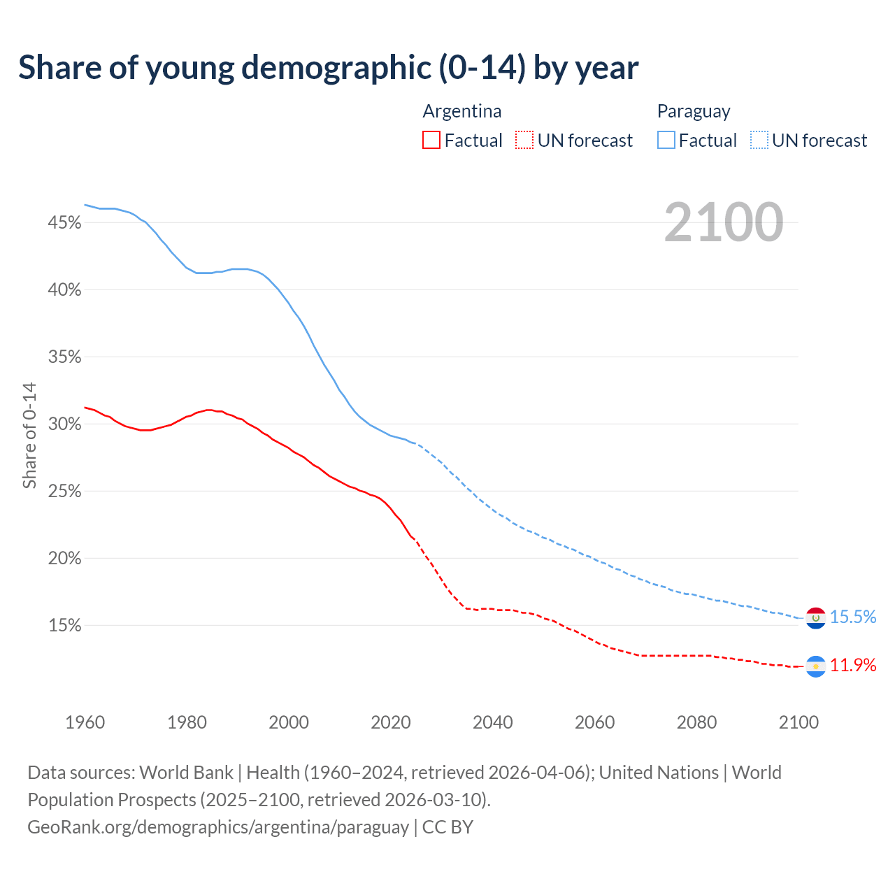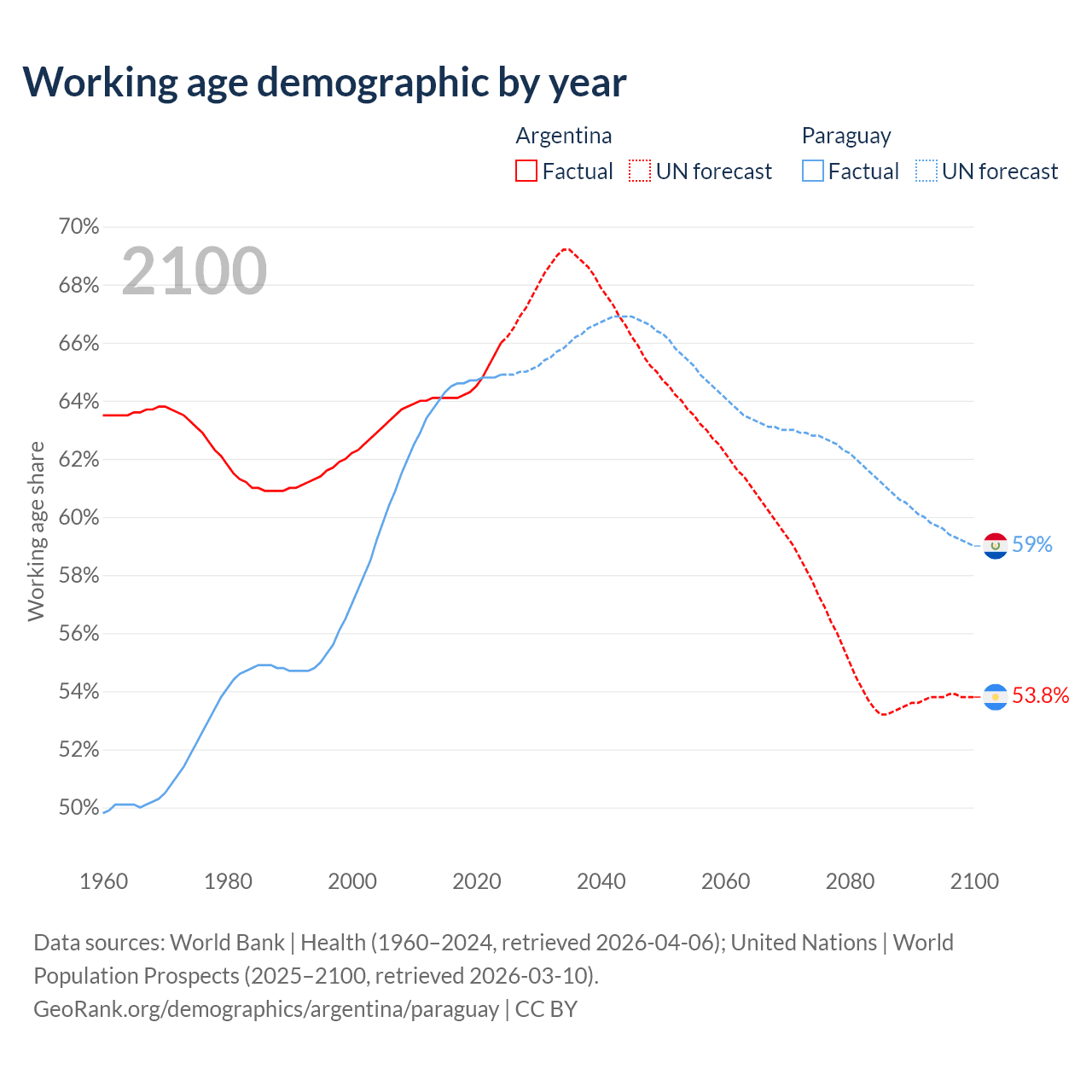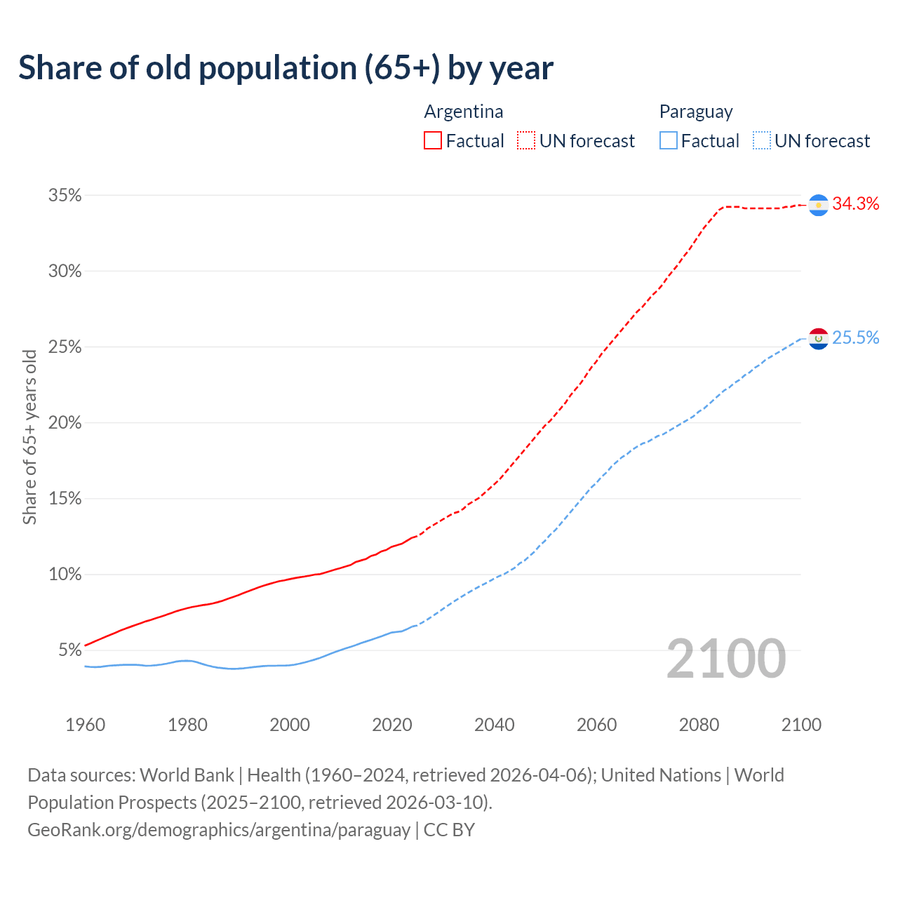 Median age Argentina vs Paraguay, 1960-2100