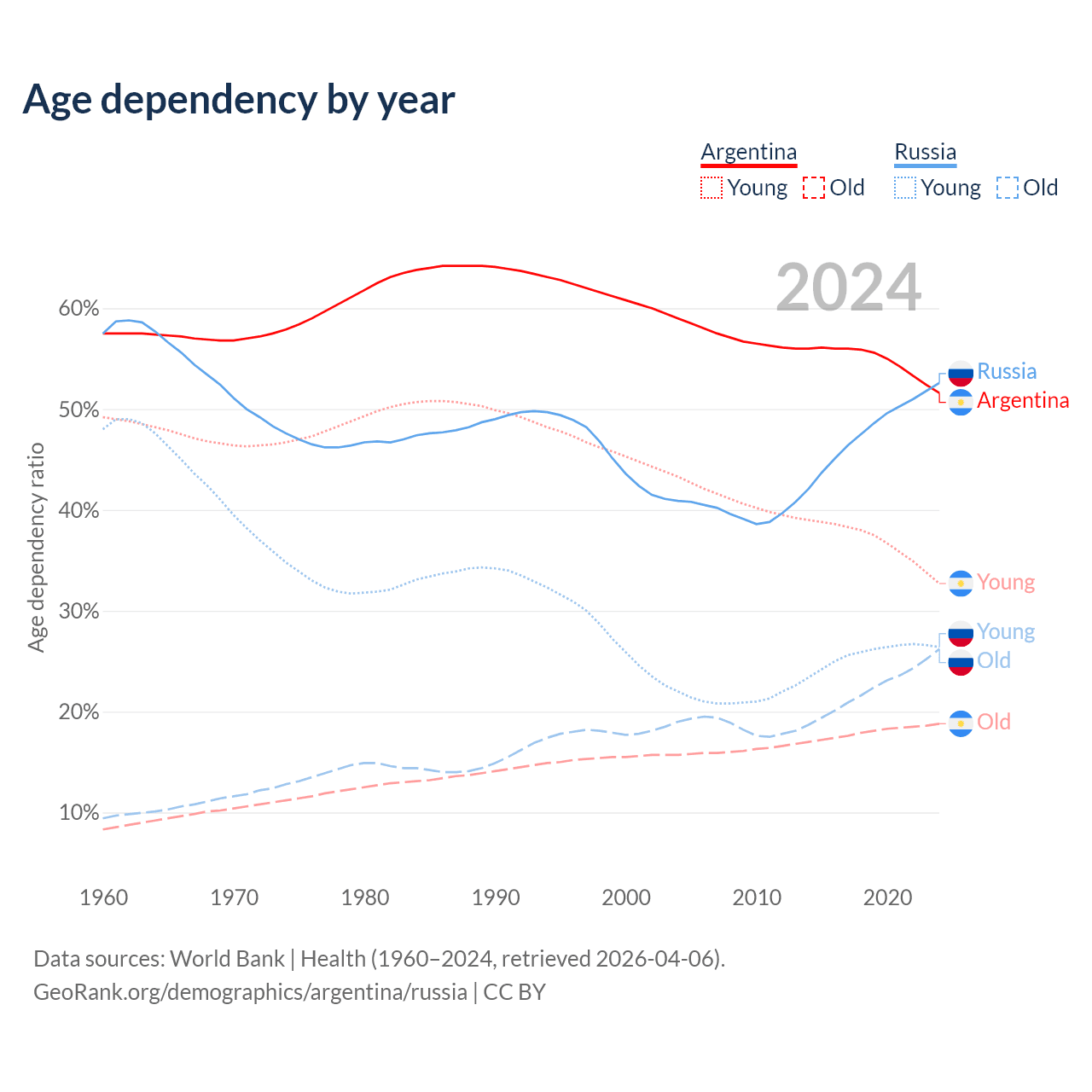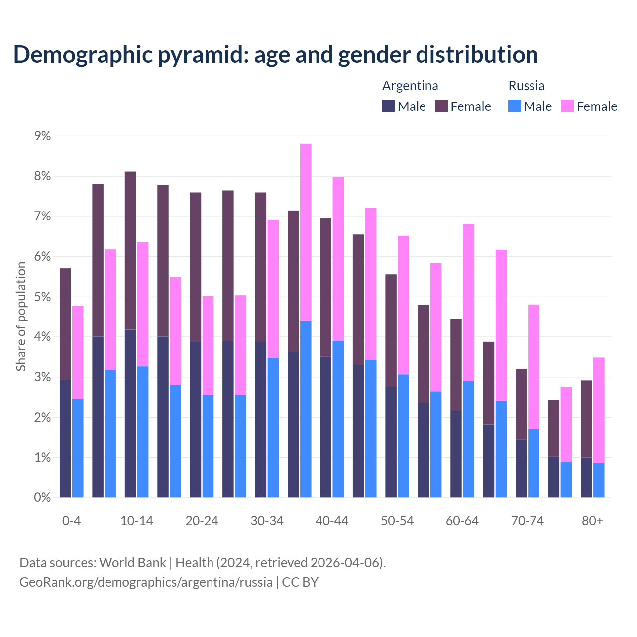 - Argentina is ranked 85/196 by median age (oldest to youngest) vs 42/196 for Russia.