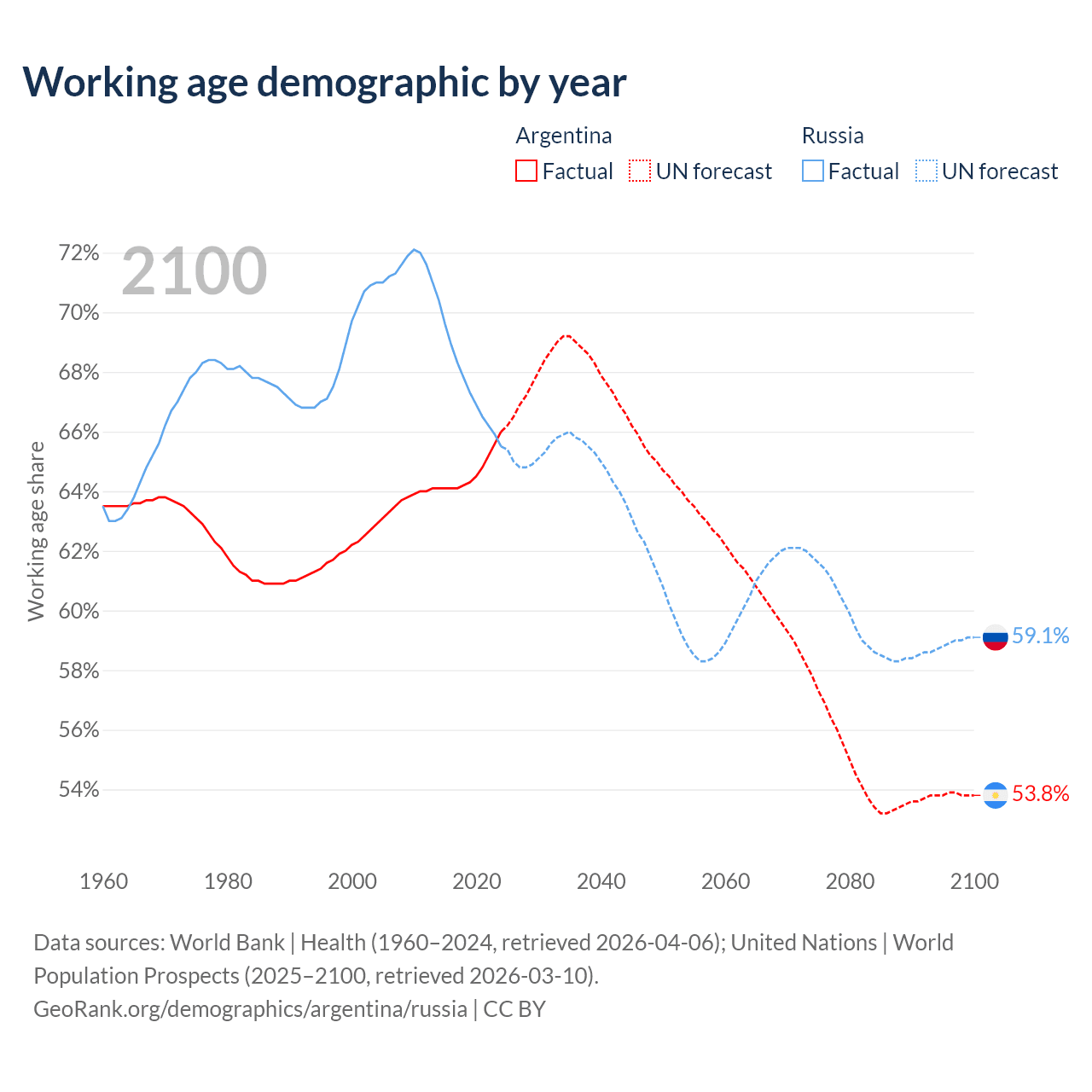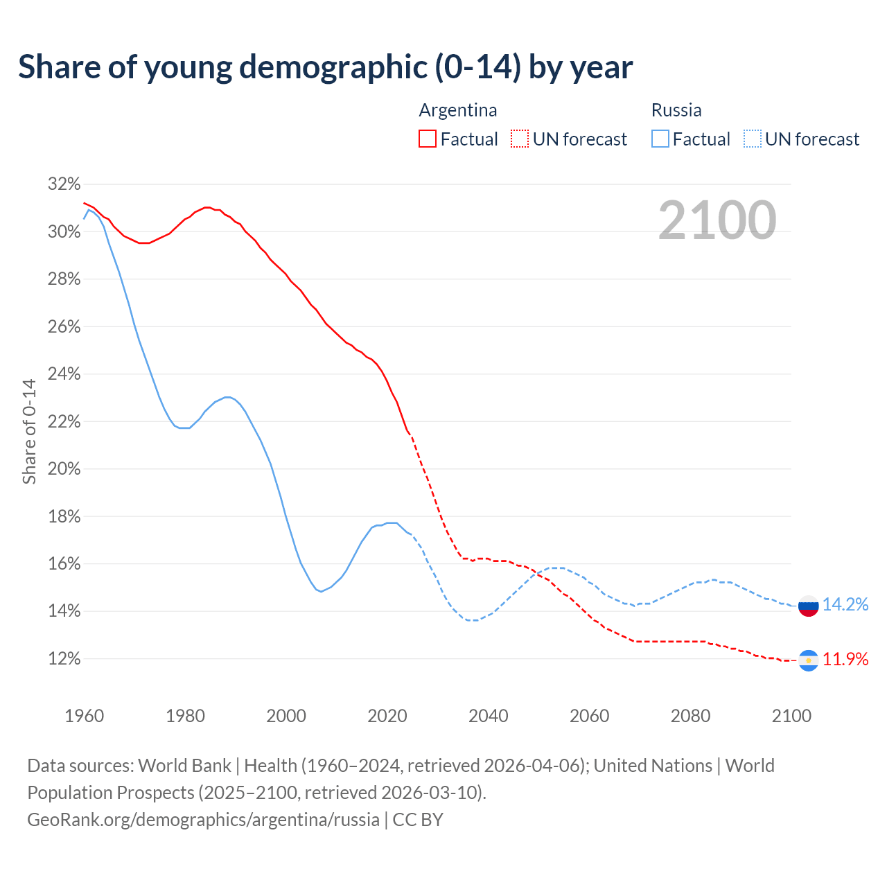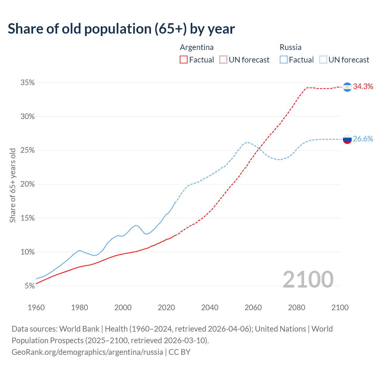 Median age Argentina vs Russia, 1960-2100