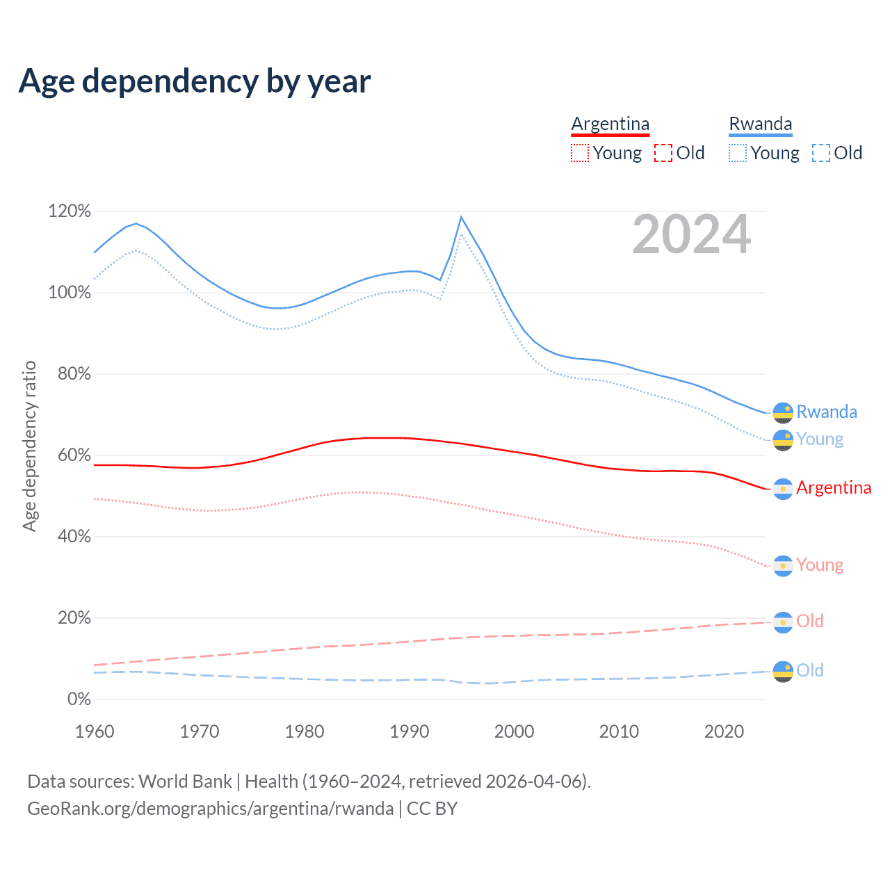 - Argentina is ranked 85/196 by median age (oldest to youngest) vs 160/196 for Rwanda.