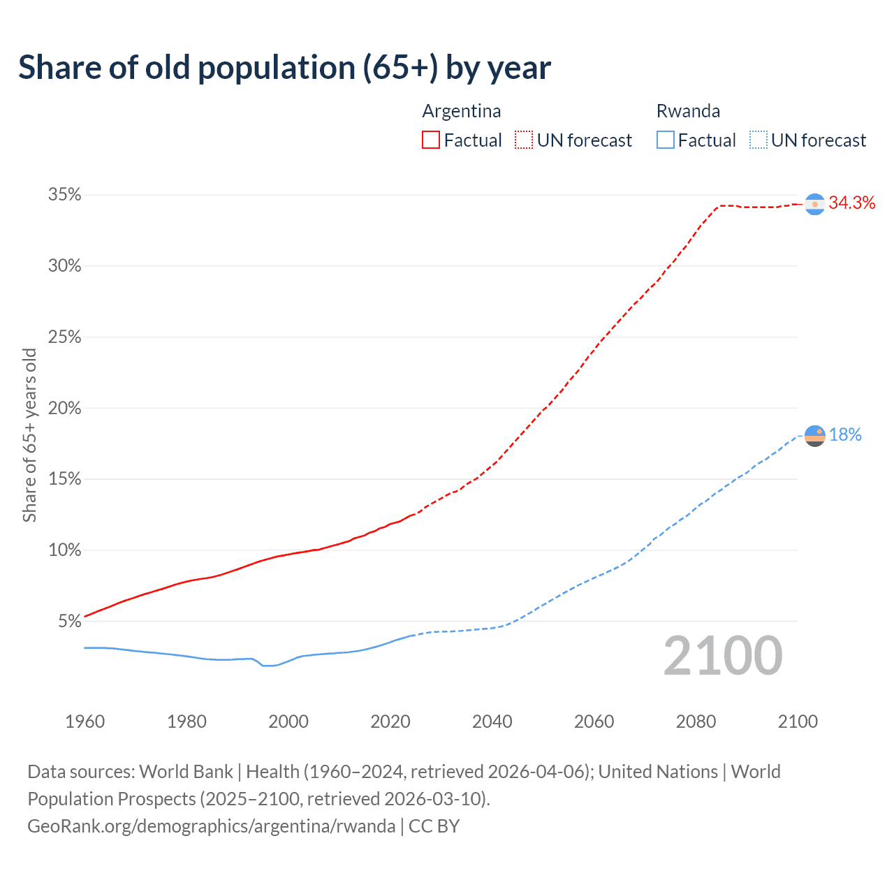 The share of older people aged 65 and over is 12.4% in Argentina and 3.93% in Rwanda. Life expectancy in Argentina compared to Rwanda .