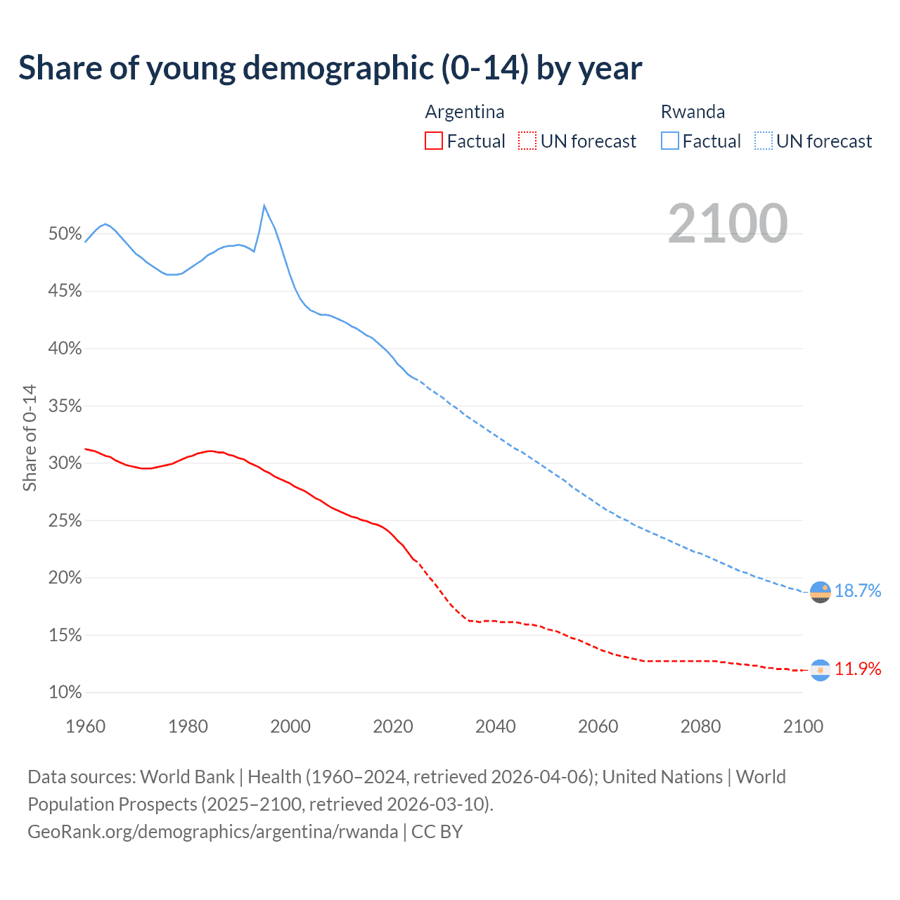 - The share of young demographic (0-15 years old) in Argentina is 21.6% vs 37.4% in Rwanda.
