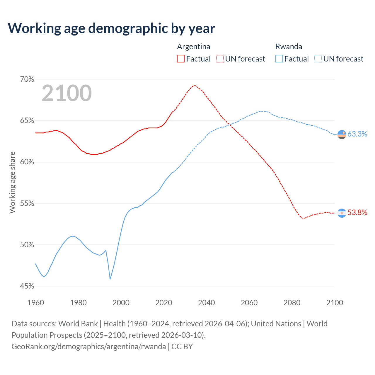 - Argentina has 30.4M working age adults (aged 15-64) vs 8.79M in Rwanda.