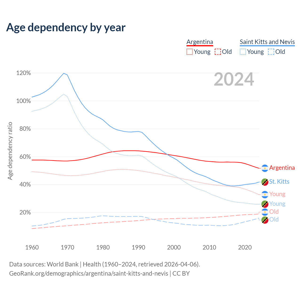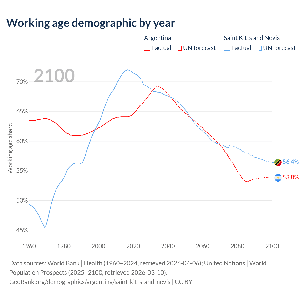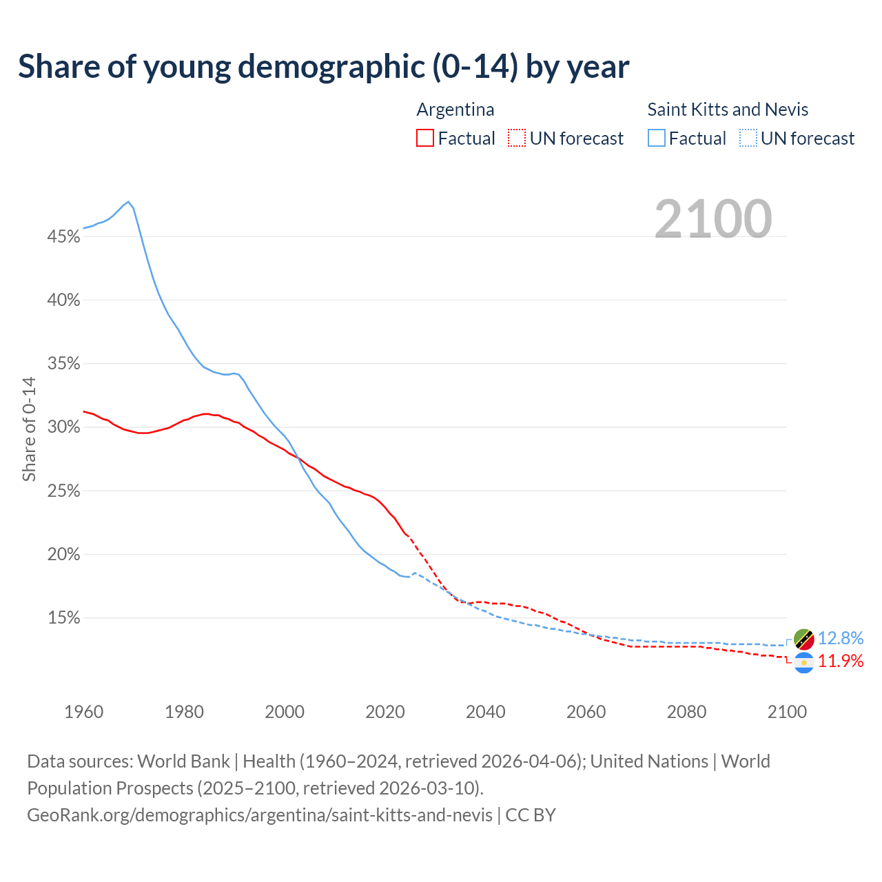 - The share of young demographic (0-15 years old) in Argentina is 21.6% vs 18.2% in Saint Kitts and Nevis.