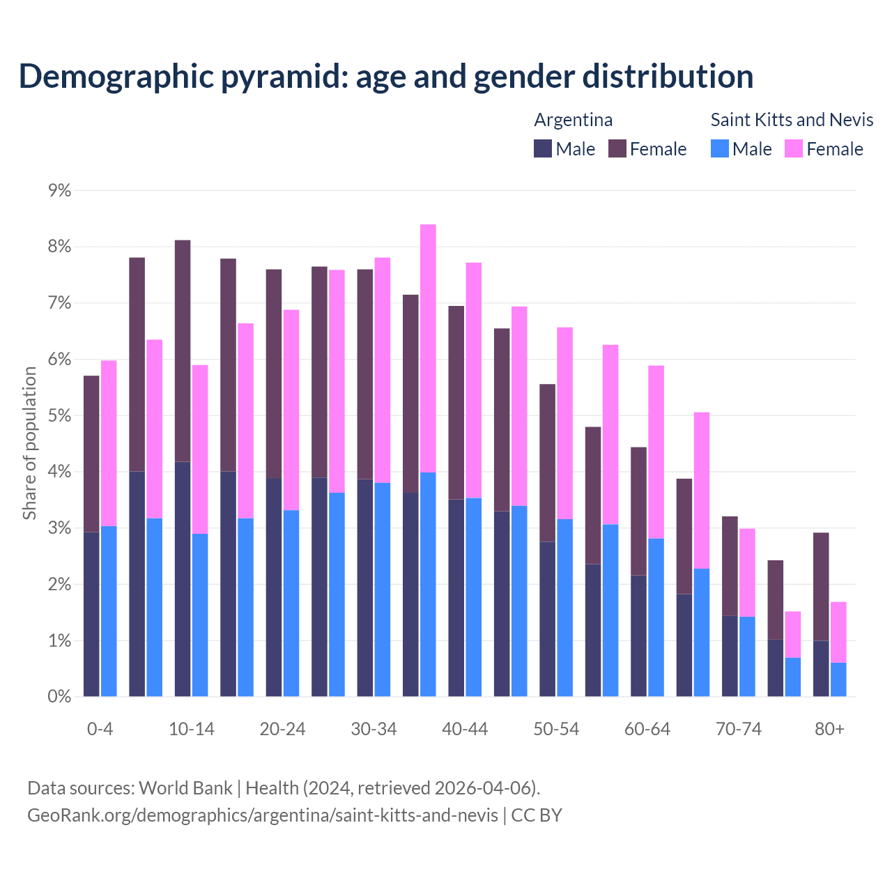- The share of old-age demographic (65+) in Argentina is 12.4% vs 11.2% in Saint Kitts and Nevis.
