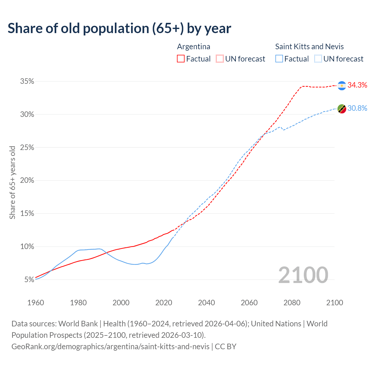 The share of older people aged 65 and over is 12.4% in Argentina and 11.2% in Saint Kitts and Nevis. Life expectancy in Argentina compared to Saint Kitts and Nevis .
