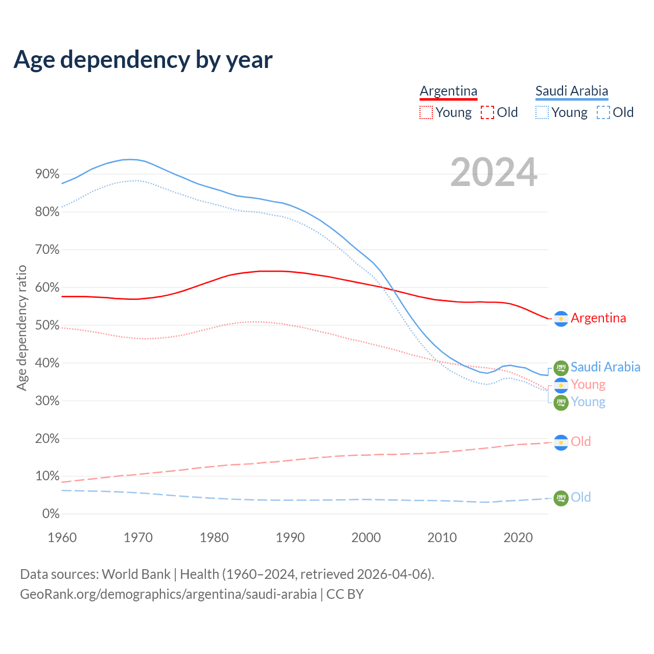 - Argentina is ranked 85/196 by median age (oldest to youngest) vs 98/196 for Saudi Arabia.