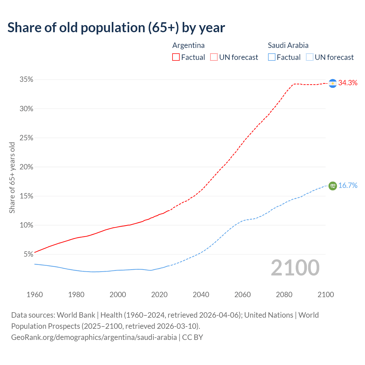 The share of older people aged 65 and over is 12.4% in Argentina and 2.95% in Saudi Arabia. Life expectancy in Argentina compared to Saudi Arabia .